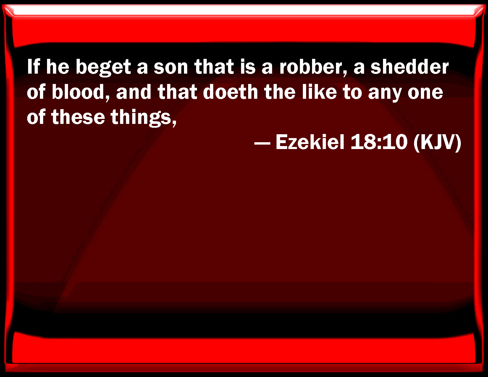 Bible Verse Slide Ezekiel 18:10 If he beget a son that is a robber, a shedder of blood, and that does the like to any one of these things, KJV: If he beget a son that is a robber, a shedder of blood, and that doeth the like to any one of these things, DRB: And if he beget a son that is a robber, a shedder of blood, and that hath done some one of these things: DBT: And if he have begotten a son that is violent, a shedder of blood, and that doeth only one of any of these things, ERV: If he beget a son that is a robber, a shedder of blood, and that doeth any one of these things, WBT: If he begetteth a son that is a robber, a shedder of blood, and that doeth the like to any one of these things, WEB: If he fathers a son who is a robber, a shedder of blood, and who does any one of these things, YLT: And — he hath begotten a son, A burglar — a shedder of blood, And he hath made a brother of one of these,Links Ezekiel 18:10 NIV • Ezekiel 18:10 NLT • Ezekiel 18:10 ESV • Ezekiel 18:10 NASB • Ezekiel 18:10 KJV • Ezekiel 18:10 Interlinear • Ezekiel 18:10 Commentaries • Ezekiel 18:10 Parallel Texts • Ezekiel 18:10 Bible Apps • Ezekiel 18:10 Parallel • Bible Hub |