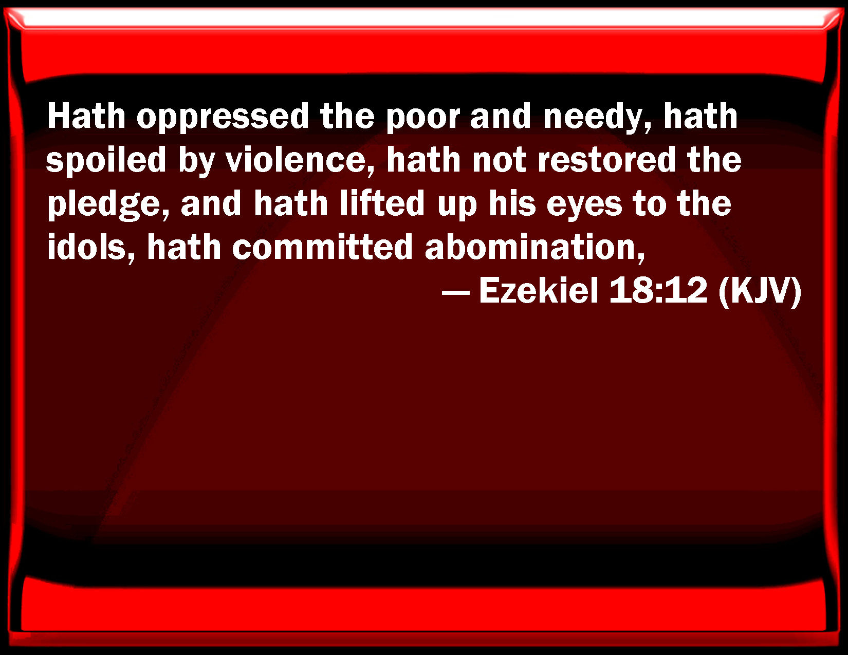 Bible Verse Slide Ezekiel 18:12 Has oppressed the poor and needy, has spoiled by violence, has not restored the pledge, and has lifted up his eyes to the idols, has committed abomination, KJV: Hath oppressed the poor and needy, hath spoiled by violence, hath not restored the pledge, and hath lifted up his eyes to the idols, hath committed abomination, DRB: That grieveth the needy and the poor, that taketh away by violence, that restoreth not the pledge, and that lifteth up his eyes to idols, that committeth abomination: DBT: hath oppressed the poor and needy, exercised robbery, hath not restored the pledge, and hath lifted up his eyes to the idols, committed abomination, ERV: hath wronged the poor and needy, hath spoiled by violence, hath not restored the pledge, and hath lifted up his eyes to the idols, hath committed abomination, WBT: Hath oppressed the poor and needy, hath stripped by violence, hath not restored the pledge, and hath lifted up his eyes to the idols, hath committed abomination. WEB: has wronged the poor and needy, has taken by robbery, has not restored the pledge, and has lifted up his eyes to the idols, has committed abomination, YLT: The afflicted and needy he hath oppressed, Plunder he hath taken violently away, A pledge he doth not return, And unto the idols he hath lifted up his eyes, Abomination he hath done!Links Ezekiel 18:12 NIV • Ezekiel 18:12 NLT • Ezekiel 18:12 ESV • Ezekiel 18:12 NASB • Ezekiel 18:12 KJV • Ezekiel 18:12 Interlinear • Ezekiel 18:12 Commentaries • Ezekiel 18:12 Parallel Texts • Ezekiel 18:12 Bible Apps • Ezekiel 18:12 Parallel • Bible Hub |