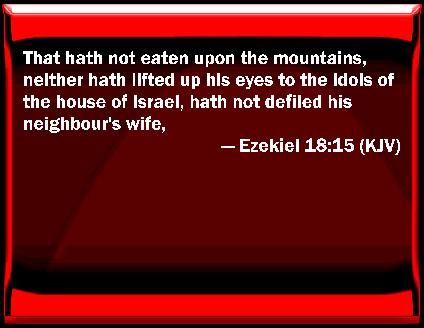 Bible Verse Slide Ezekiel 18:15 That has not eaten on the mountains, neither has lifted up his eyes to the idols of the house of Israel, has not defiled his neighbor's wife, KJV: That hath not eaten upon the mountains, neither hath lifted up his eyes to the idols of the house of Israel, hath not defiled his neighbour's wife, DRB: That hath not eaten upon the mountains, nor lifted up his eyes to the idols of the house of Israel, and hath not defiled his neighbour's wife: DBT: he hath not eaten upon the mountains, nor lifted up his eyes to the idols of the house of Israel; he hath not defiled his neighbour's wife, ERV: that hath not eaten upon the mountains, neither hath lifted up his eyes to the idols of the house of Israel, hath not defiled his neighbour's wife, WBT: That hath not eaten upon the mountains, neither hath lifted up his eyes to the idols of the house of Israel, hath not defiled his neighbor's wife, WEB: who has not eaten on the mountains, neither has lifted up his eyes to the idols of the house of Israel, has not defiled his neighbor's wife, YLT: On the mountains he hath not eaten, And his eyes he hath not lifted up Unto idols of the house of Israel, The wife of his neighbour he hath not defiled,Links Ezekiel 18:15 NIV • Ezekiel 18:15 NLT • Ezekiel 18:15 ESV • Ezekiel 18:15 NASB • Ezekiel 18:15 KJV • Ezekiel 18:15 Interlinear • Ezekiel 18:15 Commentaries • Ezekiel 18:15 Parallel Texts • Ezekiel 18:15 Bible Apps • Ezekiel 18:15 Parallel • Bible Hub |