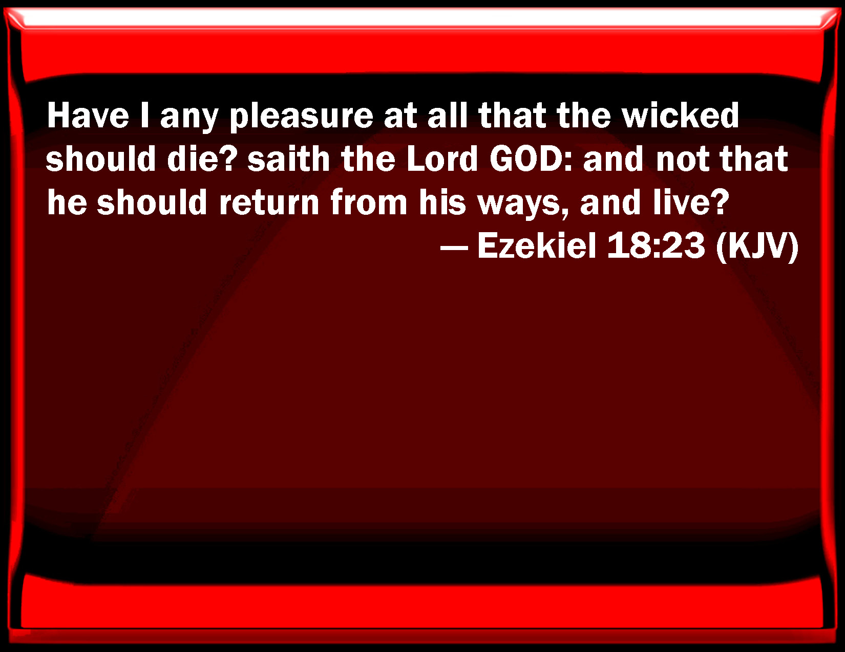 Bible Verse Slide Ezekiel 18:23 Have I any pleasure at all that the wicked should die? said the Lord GOD: and not that he should return from his ways, and live? KJV: Have I any pleasure at all that the wicked should die? saith the Lord GOD: and not that he should return from his ways, and live? DRB: Is it my will that a sinner should die, saith the Lord God, and not that he should be converted from his ways, and live? DBT: Have I any pleasure at all in the death of the wicked? saith the Lord Jehovah; is it not in his turning from his way, that he may live? ERV: Have I any pleasure in the death of the wicked? saith the Lord GOD: and not rather that he should return from his way, and live? WBT: Have I any pleasure at all that the wicked should die? saith the Lord GOD: and not that he should return from his ways, and live? WEB: Have I any pleasure in the death of the wicked? says the Lord Yahweh; and not rather that he should return from his way, and live? YLT: Do I at all desire the death of the wicked? An affirmation of the Lord Jehovah, Is it not in his turning back from his way — And he hath lived?Links Ezekiel 18:23 NIV • Ezekiel 18:23 NLT • Ezekiel 18:23 ESV • Ezekiel 18:23 NASB • Ezekiel 18:23 KJV • Ezekiel 18:23 Interlinear • Ezekiel 18:23 Commentaries • Ezekiel 18:23 Parallel Texts • Ezekiel 18:23 Bible Apps • Ezekiel 18:23 Parallel • Bible Hub |