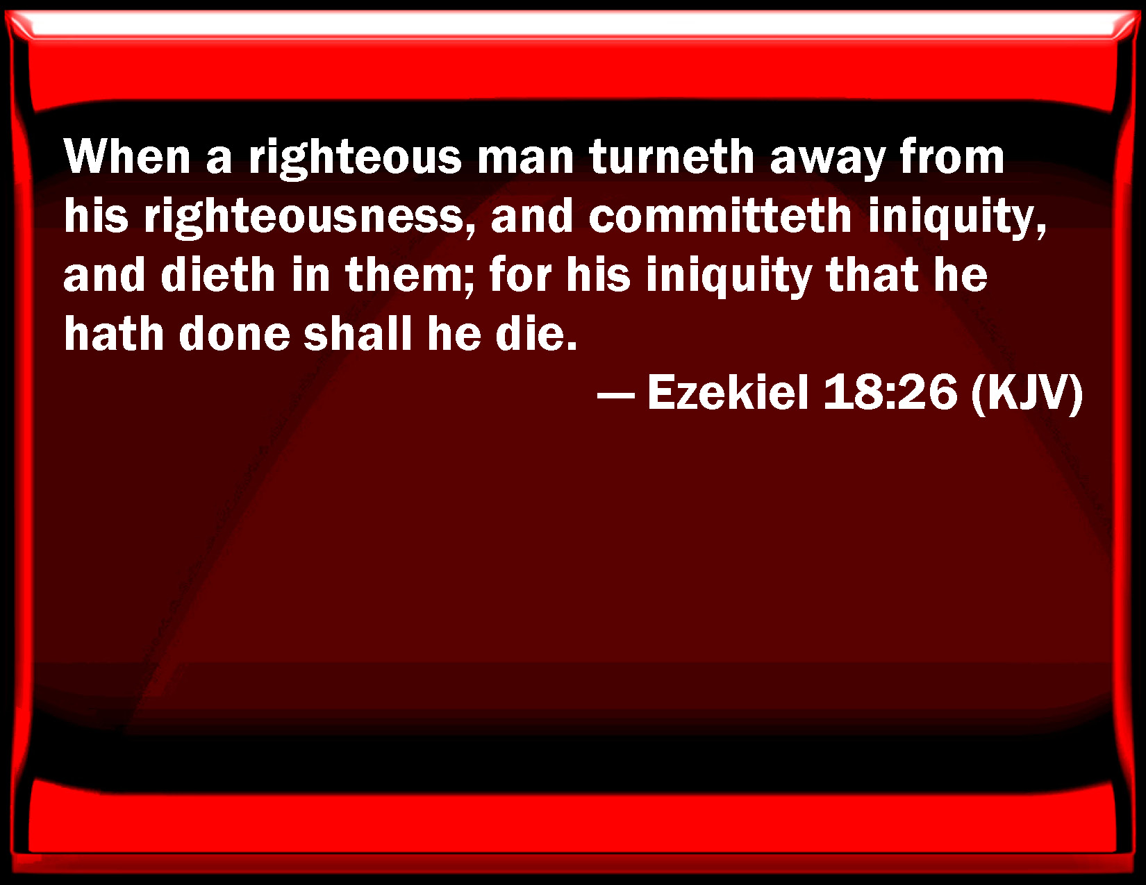 Bible Verse Slide Ezekiel 18:26 When a righteous man turns away from his righteousness, and commits iniquity, and dies in them; for his iniquity that he has done shall he die. KJV: When a righteous man turneth away from his righteousness, and committeth iniquity, and dieth in them; for his iniquity that he hath done shall he die. DRB: For when the just turneth himself away from his justice, and committeth iniquity, he shall die therein: in the injustice that he hath wrought he shall die. DBT: When the righteous turneth away from his righteousness, and practiseth what is wrong, and dieth for it; in his wrong that he hath done shall he die. ERV: When the righteous man turneth away from his righteousness, and committeth iniquity, and dieth therein; in his iniquity that he hath done shall he die. WBT: When a righteous man turneth away from his righteousness, and committeth iniquity, and dieth in them; for his iniquity that he hath done shall he die. WEB: When the righteous man turns away from his righteousness, and commits iniquity, and dies therein; in his iniquity that he has done shall he die. YLT: In the turning back of the righteous from his righteousness, And he hath done perversity, And he is dying by them, for his perversity That he hath done he dieth.Links Ezekiel 18:26 NIV • Ezekiel 18:26 NLT • Ezekiel 18:26 ESV • Ezekiel 18:26 NASB • Ezekiel 18:26 KJV • Ezekiel 18:26 Interlinear • Ezekiel 18:26 Commentaries • Ezekiel 18:26 Parallel Texts • Ezekiel 18:26 Bible Apps • Ezekiel 18:26 Parallel • Bible Hub |