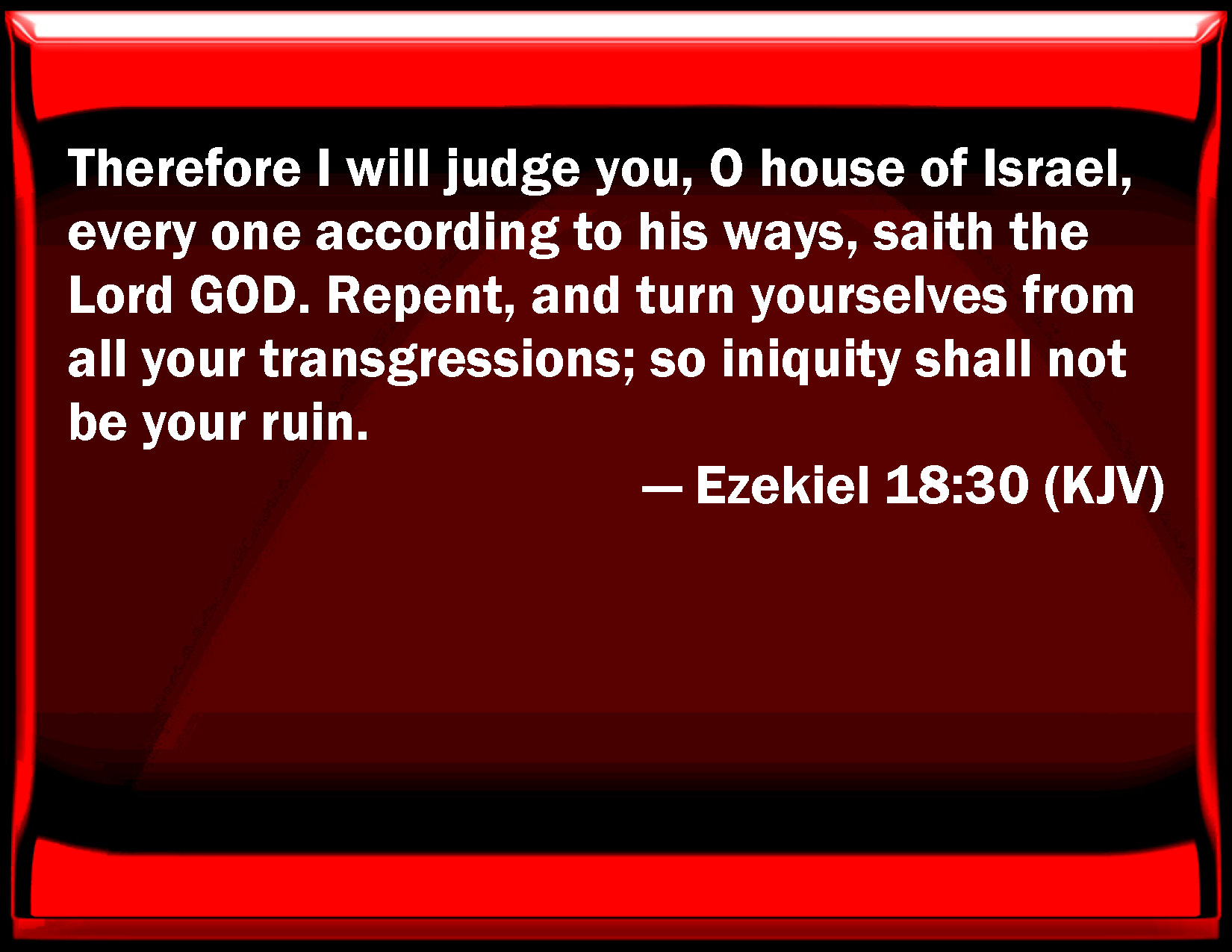 Bible Verse Slide Ezekiel 18:30 Therefore I will judge you, O house of Israel, every one according to his ways, said the Lord GOD. Repent, and turn yourselves from all your transgressions; so iniquity shall not be your ruin. KJV: Therefore I will judge you, O house of Israel, every one according to his ways, saith the Lord GOD. Repent, and turn yourselves from all your transgressions; so iniquity shall not be your ruin. DRB: Therefore will I judge every man according to his ways, O house of Israel, saith the Lord God. Be converted, and do penance for all your iniquities: and iniquity shall not be your ruin. DBT: Therefore I will judge you, house of Israel, every one according to his ways, saith the Lord Jehovah. Return ye, and turn from all your transgressions; so iniquity shall not be your snare. ERV: Therefore I will judge you, O house of Israel, every one according to his ways, saith the Lord GOD. Return ye, and turn yourselves from all your transgressions; so iniquity shall not be your ruin. WBT: Therefore I will judge you, O house of Israel, every one according to his ways, saith the Lord GOD. Repent, and turn yourselves from all your transgressions; so iniquity shall not be your ruin. WEB: Therefore I will judge you, house of Israel, everyone according to his ways, says the Lord Yahweh. Return, and turn yourselves from all your transgressions; so iniquity shall not be your ruin. YLT: Therefore, each according to his ways I judge you, O house of Israel? An affirmation of the Lord Jehovah, Turn ye back, yea, turn yourselves back, From all your transgressions, And iniquity is not to you for a stumbling-block,Links Ezekiel 18:30 NIV • Ezekiel 18:30 NLT • Ezekiel 18:30 ESV • Ezekiel 18:30 NASB • Ezekiel 18:30 KJV • Ezekiel 18:30 Interlinear • Ezekiel 18:30 Commentaries • Ezekiel 18:30 Parallel Texts • Ezekiel 18:30 Bible Apps • Ezekiel 18:30 Parallel • Bible Hub |