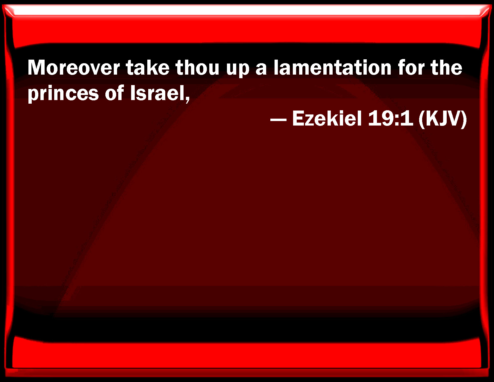 Bible Verse Slide Ezekiel 19:1 Moreover take you up a lamentation for the princes of Israel, KJV: Moreover take thou up a lamentation for the princes of Israel, DRB: Moreover take thou up a lamentation for the princes of Israel, DBT: And thou, take thou up a lamentation for the princes of Israel, ERV: Moreover, take thou up a lamentation for the princes of Israel, WBT: Moreover take thou up a lamentation for the princes of Israel, WEB: Moreover, take up a lamentation for the princes of Israel, YLT: And thou, lift up a lamentation unto princes of Israel,Links Ezekiel 19:1 NIV • Ezekiel 19:1 NLT • Ezekiel 19:1 ESV • Ezekiel 19:1 NASB • Ezekiel 19:1 KJV • Ezekiel 19:1 Interlinear • Ezekiel 19:1 Commentaries • Ezekiel 19:1 Parallel Texts • Ezekiel 19:1 Bible Apps • Ezekiel 19:1 Parallel • Bible Hub |