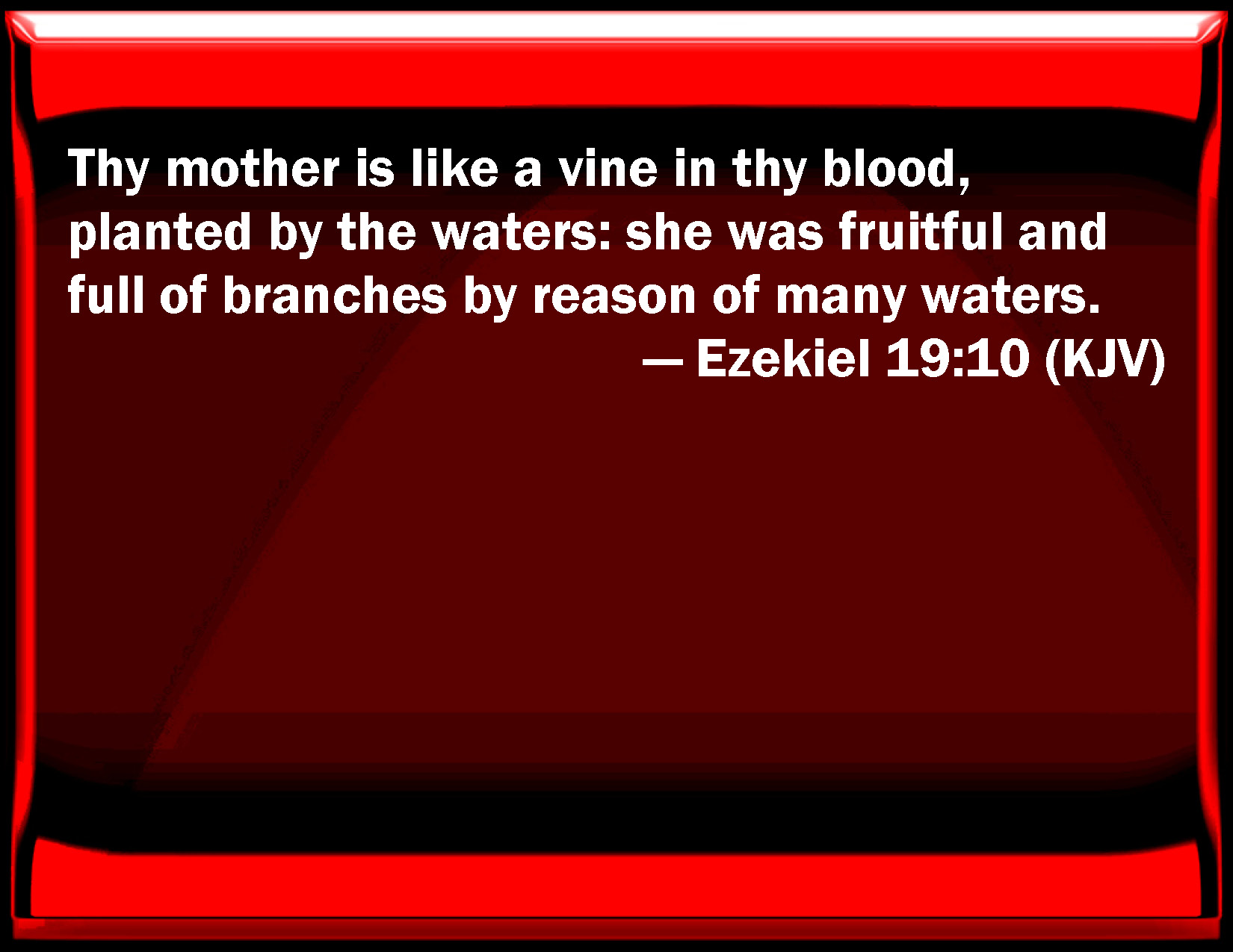 Bible Verse Slide Ezekiel 19:10 Your mother is like a vine in your blood, planted by the waters: she was fruitful and full of branches by reason of many waters. KJV: Thy mother is like a vine in thy blood, planted by the waters: she was fruitful and full of branches by reason of many waters. DRB: Thy mother is like a vine in thy blood planted by the water: her fruit and her branches have grown out of many waters. DBT: Thy mother was as a vine, in thy rest, planted by the waters: it was fruitful and full of branches by reason of many waters. ERV: Thy mother was like a vine, in thy blood, planted by the waters: she was fruitful and full of branches by reason of many waters. WBT: Thy mother is like a vine in thy blood, planted by the waters: she was fruitful and full of branches by reason of many waters. WEB: Your mother was like a vine, in your blood, planted by the waters: it was fruitful and full of branches by reason of many waters. YLT: Thy mother is as a vine in thy blood by waters planted, Fruitful and full of boughs it hath been, Because of many waters.Links Ezekiel 19:10 NIV • Ezekiel 19:10 NLT • Ezekiel 19:10 ESV • Ezekiel 19:10 NASB • Ezekiel 19:10 KJV • Ezekiel 19:10 Interlinear • Ezekiel 19:10 Commentaries • Ezekiel 19:10 Parallel Texts • Ezekiel 19:10 Bible Apps • Ezekiel 19:10 Parallel • Bible Hub |