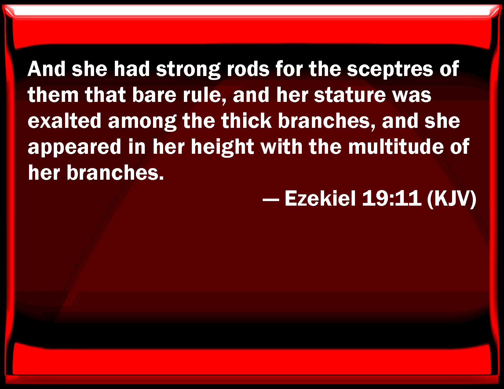 Bible Verse Slide Ezekiel 19:11 And she had strong rods for the scepters of them that bore rule, and her stature was exalted among the thick branches, and she appeared in her height with the multitude of her branches. KJV: And she had strong rods for the sceptres of them that bare rule, and her stature was exalted among the thick branches, and she appeared in her height with the multitude of her branches. DRB: And she hath strong rods to make sceptres for them that bear rule, and her stature was exalted among the branches: and she saw her height in the multitude of her branches. DBT: And it had strong rods for sceptres of them that bear rule, and its stature was exalted between the thick boughs; and it was conspicuous by its height with the multitude of its branches. ERV: And she had strong rods for the sceptres of them that bare rule, and their stature was exalted among the thick boughs, and they were seen in their height with the multitude of their branches. WBT: And she had strong rods for the scepters of them that bore rule, and her stature was exalted among the thick branches, and she appeared in her hight with the multitude of her branches. WEB: It had strong rods for the scepters of those who bore rule, and their stature was exalted among the thick boughs, and they were seen in their height with the multitude of their branches. YLT: And it hath strong rods for sceptres of rulers, And high is its stature above thick branches, And it appeareth in its height In the multitude of its thin shoots.Links Ezekiel 19:11 NIV • Ezekiel 19:11 NLT • Ezekiel 19:11 ESV • Ezekiel 19:11 NASB • Ezekiel 19:11 KJV • Ezekiel 19:11 Interlinear • Ezekiel 19:11 Commentaries • Ezekiel 19:11 Parallel Texts • Ezekiel 19:11 Bible Apps • Ezekiel 19:11 Parallel • Bible Hub |