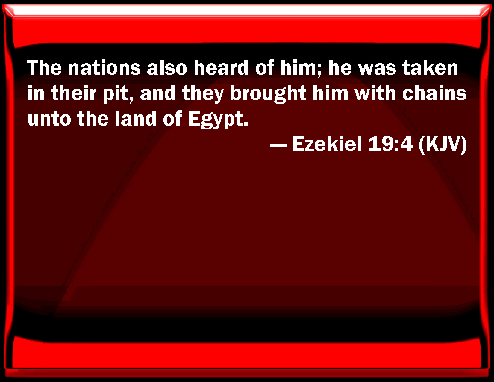 Ezekiel 19:4 The nations also heard of him; he was taken in their pit, and they brought him with chains to the land of Egypt.