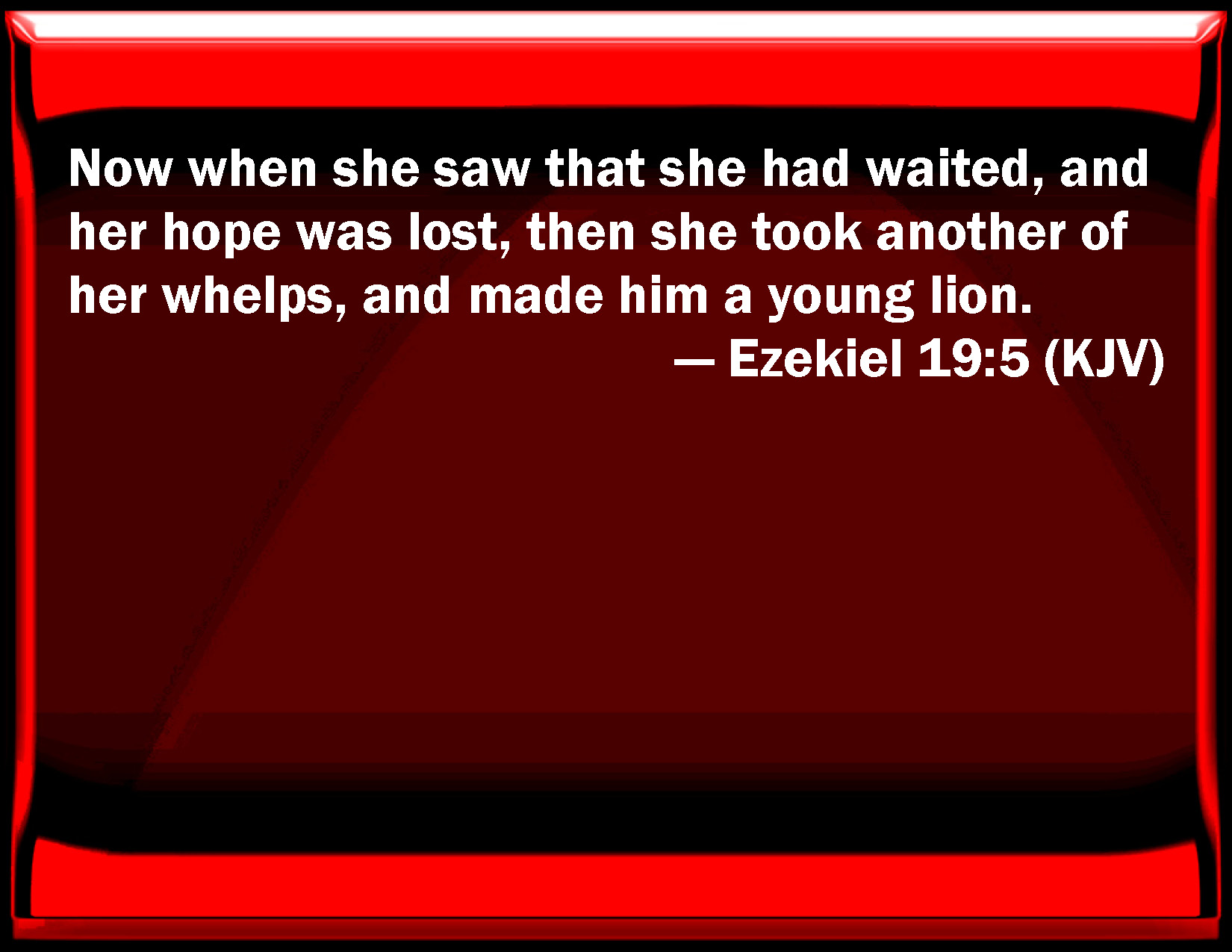 Bible Verse Slide Ezekiel 19:5 Now when she saw that she had waited, and her hope was lost, then she took another of her whelps, and made him a young lion. KJV: Now when she saw that she had waited, and her hope was lost, then she took another of her whelps, and made him a young lion. DRB: But she seeing herself weakened, and that her hope was lost, took one of her young lions, and set him up for a lion. DBT: And when she saw that she had waited and her hope was lost, she took another of her whelps, and made him a young lion. ERV: Now when she saw that she had waited, and her hope was lost, then she took another of her whelps, and made him a young lion. WBT: Now when she saw that she had waited, and her hope was lost, then she took another of her whelps, and made him a young lion. WEB: Now when she saw that she had waited, and her hope was lost, then she took another of her cubs, and made him a young lion. YLT: And she seeth, that stayed — perished hath her hope, And she taketh one of her whelps, A young lion she hath made it.Links Ezekiel 19:5 NIV • Ezekiel 19:5 NLT • Ezekiel 19:5 ESV • Ezekiel 19:5 NASB • Ezekiel 19:5 KJV • Ezekiel 19:5 Interlinear • Ezekiel 19:5 Commentaries • Ezekiel 19:5 Parallel Texts • Ezekiel 19:5 Bible Apps • Ezekiel 19:5 Parallel • Bible Hub |