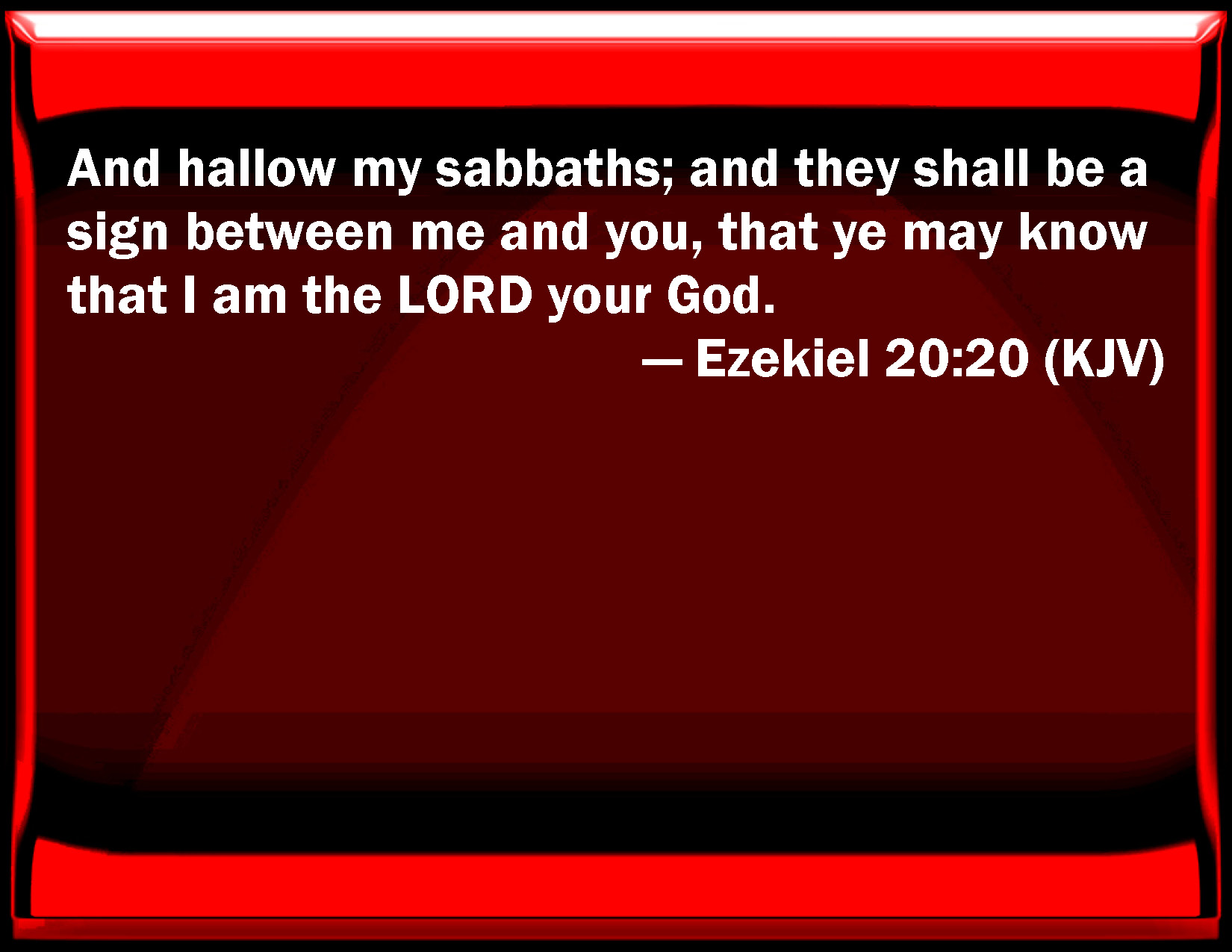 Bible Verse Slide Ezekiel 20:20 And hallow my sabbaths; and they shall be a sign between me and you, that you may know that I am the LORD your God. KJV: And hallow my sabbaths; and they shall be a sign between me and you, that ye may know that I am the LORD your God. DRB: And sanctify my sabbaths, that they may be a sign between me and you: and that you may know that I am the Lord your God. DBT: and hallow my sabbaths; and they shall be a sign between me and you, that ye may know that I am Jehovah your God. ERV: and hallow my sabbaths; and they shall be a sign between me and you, that ye may know that I am the LORD your God. WBT: And hallow my sabbaths; and they shall be a sign between me and you, that ye may know that I am the LORD your God. WEB: and make my Sabbaths holy; and they shall be a sign between me and you, that you may know that I am Yahweh your God. YLT: And My sabbaths sanctify, And they have been for a sign between Me and you, To know that I, Jehovah, am your God.Links Ezekiel 20:20 NIV • Ezekiel 20:20 NLT • Ezekiel 20:20 ESV • Ezekiel 20:20 NASB • Ezekiel 20:20 KJV • Ezekiel 20:20 Interlinear • Ezekiel 20:20 Commentaries • Ezekiel 20:20 Parallel Texts • Ezekiel 20:20 Bible Apps • Ezekiel 20:20 Parallel • Bible Hub |