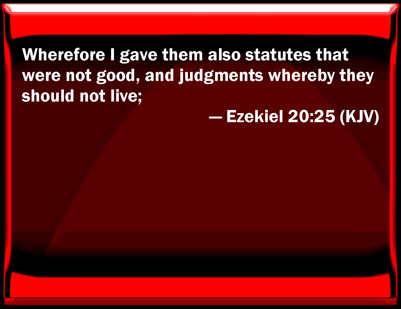 Bible Verse Slide Ezekiel 20:25 Why I gave them also statutes that were not good, and judgments whereby they should not live; KJV: Wherefore I gave them also statutes that were not good, and judgments whereby they should not live; DRB: Therefore I also gave them statutes that were not good, and judgments, in which they shall not live. DBT: And I also gave them statutes that were not good, and ordinances whereby they should not live; ERV: Moreover also I gave them statutes that were not good, and judgments wherein they should not live; WBT: Wherefore I gave them also statutes that were not good, and judgments by which they should not live; WEB: Moreover also I gave them statutes that were not good, and ordinances in which they should not live; YLT: And I also, I have given to them statutes not good, And judgments by which they do not live.Links Ezekiel 20:25 NIV • Ezekiel 20:25 NLT • Ezekiel 20:25 ESV • Ezekiel 20:25 NASB • Ezekiel 20:25 KJV • Ezekiel 20:25 Interlinear • Ezekiel 20:25 Commentaries • Ezekiel 20:25 Parallel Texts • Ezekiel 20:25 Bible Apps • Ezekiel 20:25 Parallel • Bible Hub |