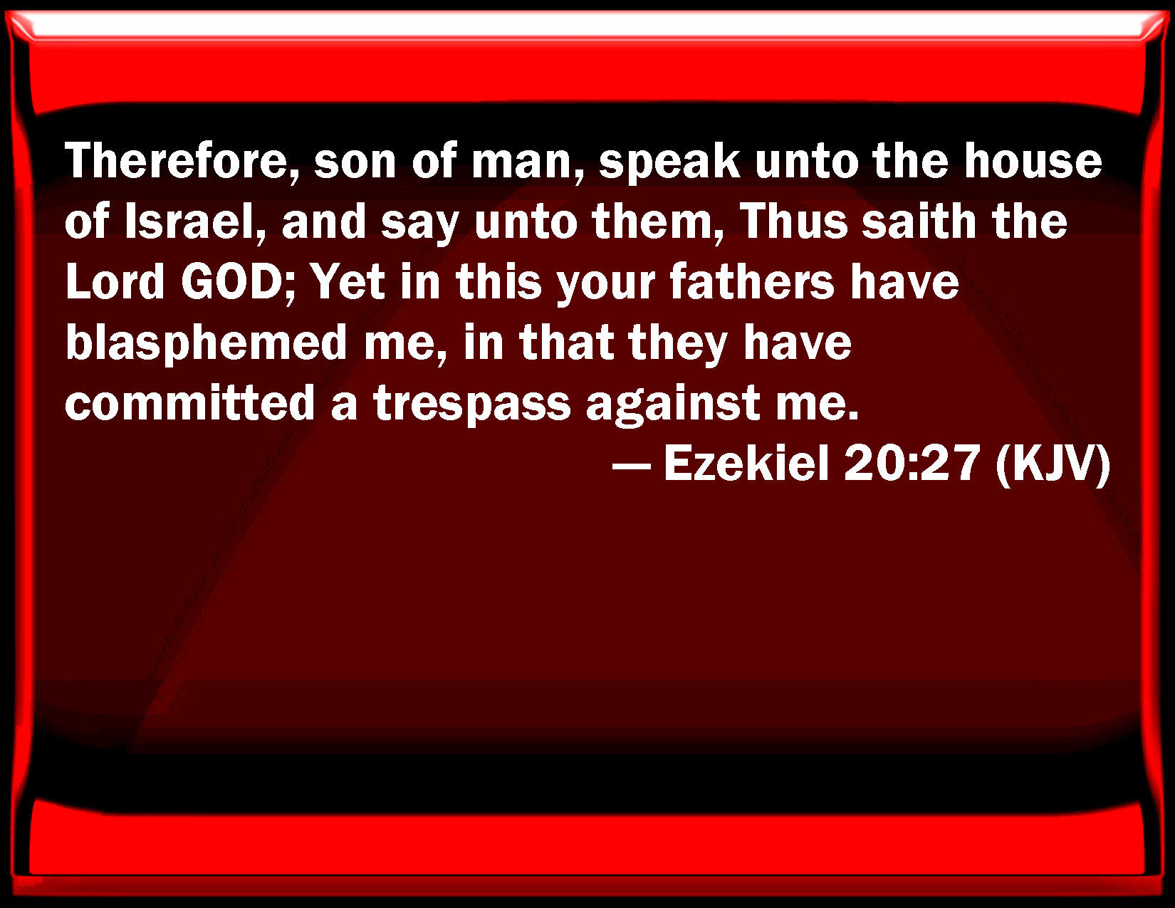 Bible Verse Slide Ezekiel 20:27 Therefore, son of man, speak to the house of Israel, and say to them, Thus said the Lord GOD; Yet in this your fathers have blasphemed me, in that they have committed a trespass against me. KJV: Therefore, son of man, speak unto the house of Israel, and say unto them, Thus saith the Lord GOD; Yet in this your fathers have blasphemed me, in that they have committed a trespass against me. DRB: Wherefore speak to the house of Israel, O son of man, and say to them: Thus saith the Lord God: Moreover in this also your fathers blasphemed me, when they had despised and contemned me; DBT: Therefore, son of man, speak unto the house of Israel, and say unto them, Thus saith the Lord Jehovah: In this moreover have your fathers blasphemed me, in that they have wrought unfaithfulness against me. ERV: Therefore, son of man, speak unto the house of Israel, and say unto them, Thus saith the Lord GOD: In this moreover have your fathers blasphemed me, in that they have committed a trespass against me. WBT: Therefore, son of man, speak to the house of Israel, and say to them, Thus saith the Lord GOD; Yet in this your fathers have blasphemed me, in that they have committed a trespass against me. WEB: Therefore, son of man, speak to the house of Israel, and tell them, Thus says the Lord Yahweh: In this moreover have your fathers blasphemed me, in that they have committed a trespass against me. YLT: Therefore, speak unto the house of Israel, son of man, and thou hast said unto them, Thus said the Lord Jehovah: Still in this have your fathers reviled Me, In their committing against Me a trespass.Links Ezekiel 20:27 NIV • Ezekiel 20:27 NLT • Ezekiel 20:27 ESV • Ezekiel 20:27 NASB • Ezekiel 20:27 KJV • Ezekiel 20:27 Interlinear • Ezekiel 20:27 Commentaries • Ezekiel 20:27 Parallel Texts • Ezekiel 20:27 Bible Apps • Ezekiel 20:27 Parallel • Bible Hub |