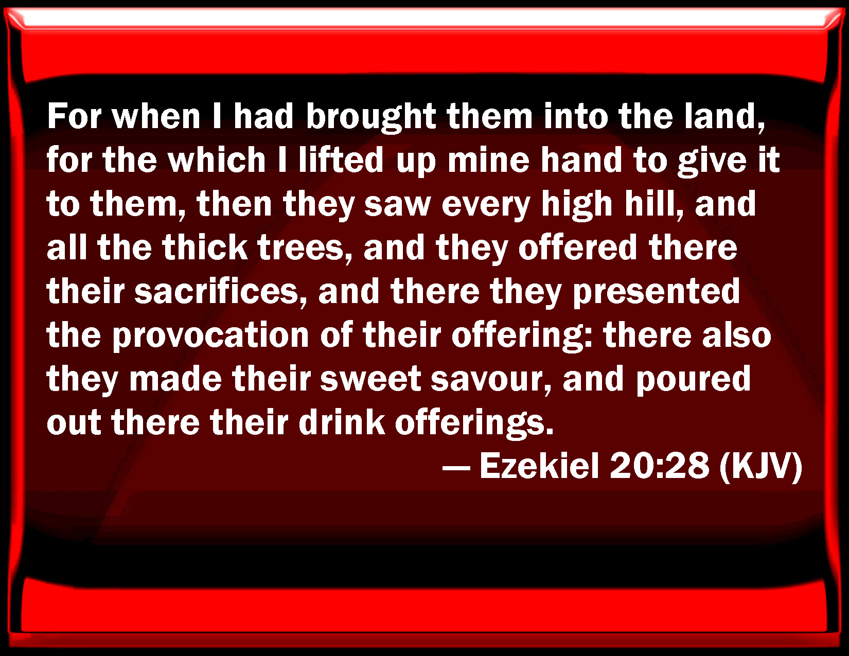Bible Verse Slide Ezekiel 20:28 For when I had brought them into the land, for the which I lifted up my hand to give it to them, then they saw every high hill, and all the thick trees, and they offered there their sacrifices, and there they presented the provocation of their offering: there also they made their sweet smell, and poured out there their drink offerings. KJV: For when I had brought them into the land, for the which I lifted up mine hand to give it to them, then they saw every high hill, and all the thick trees, and they offered there their sacrifices, and there they presented the provocation of their offering: there also they made their sweet savour, and poured out there their drink offerings. DRB: And I had brought them into the land, for which I lifted up my hand to give it them: they saw every high hill, and every shady tree, and there they sacrificed their victims: and there they presented the provocation of their offerings, and there they set their sweet odours, and poured forth their libations. DBT: When I had brought them into the land which I had lifted up my hand to give unto them, then they saw every high hill and all the thick trees, and they offered there their sacrifices, and there they presented the provocation of their offering; and there they placed their sweet savour, and there poured out their drink-offerings. ERV: For when I had brought them into the land, which I lifted up mine hand to give unto them, then they saw every high hill, and every thick tree, and they offered there their sacrifices, and there they presented the provocation of their offering, there also they made their sweet savour, and they poured out there their drink offerings. WBT: For when I had brought them into the land, for which I lifted up my hand to give it to them, then they saw every high hill, and all the thick trees, and they offered there their sacrifices, and there they presented the provocation of their offering: there also they made their sweet savor, and poured out there their drink-offerings. WEB: For when I had brought them into the land, which I swore to give to them, then they saw every high hill, and every thick tree, and they offered there their sacrifices, and there they presented the provocation of their offering; there also they made their pleasant aroma, and they poured out there their drink offerings. YLT: And I bring them in unto the land, That I did lift up My hand to give to them, And they see every high hill, and every thick tree, And they sacrifice there their sacrifices, And give there the provocation of their offering, And make there their sweet fragrance, And they pour out there their libations.Links Ezekiel 20:28 NIV • Ezekiel 20:28 NLT • Ezekiel 20:28 ESV • Ezekiel 20:28 NASB • Ezekiel 20:28 KJV • Ezekiel 20:28 Interlinear • Ezekiel 20:28 Commentaries • Ezekiel 20:28 Parallel Texts • Ezekiel 20:28 Bible Apps • Ezekiel 20:28 Parallel • Bible Hub |