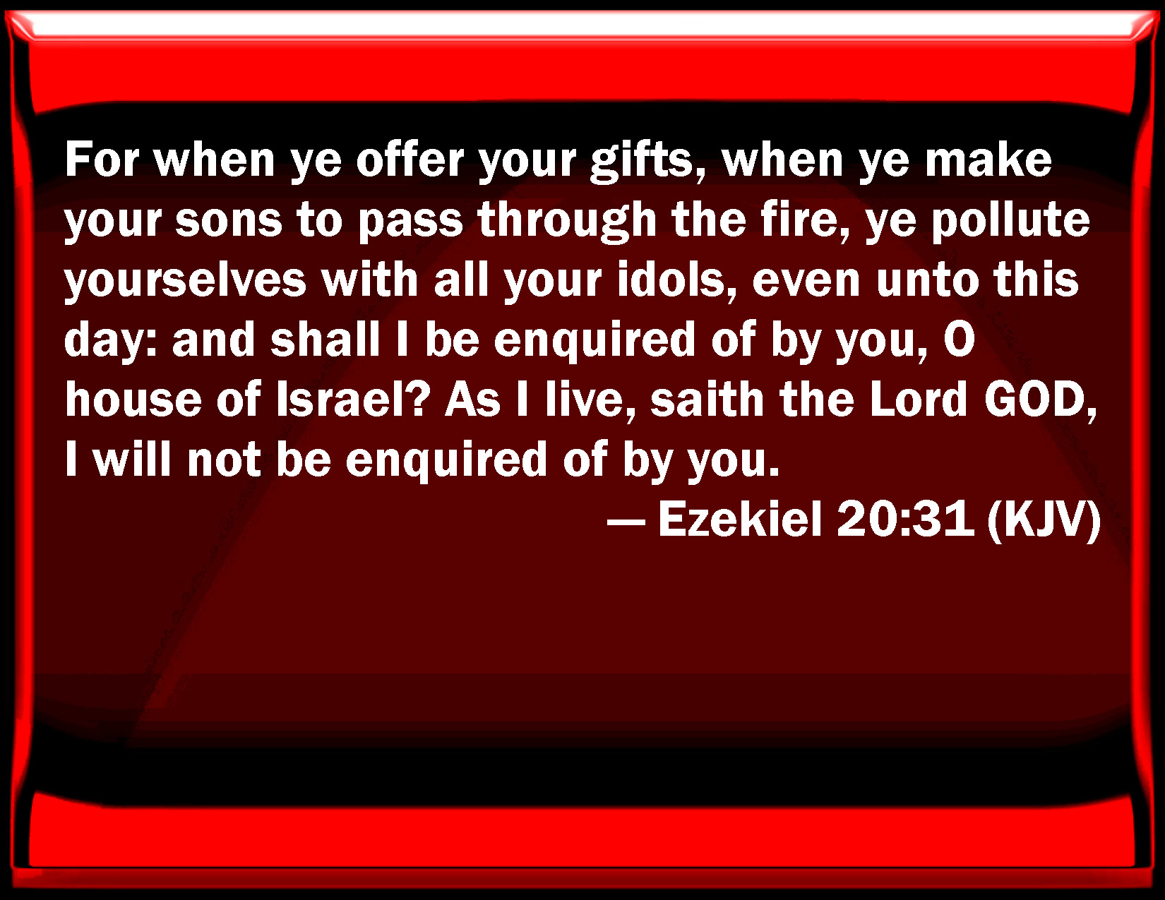 Bible Verse Slide Ezekiel 20:31 For when you offer your gifts, when you make your sons to pass through the fire, you pollute yourselves with all your idols, even to this day: and shall I be inquired of by you, O house of Israel? As I live, said the Lord GOD, I will not be inquired of by you. KJV: For when ye offer your gifts, when ye make your sons to pass through the fire, ye pollute yourselves with all your idols, even unto this day: and shall I be inquired of by you, O house of Israel? As I live, saith the Lord GOD, I will not be inquired of by you. DRB: And you defile yourselves with all your: idols unto this day, in the offering of your gifts, when you make your children pass through the fire: and shall I answer you, O house of Israel? As I live, saith the Lord God, I will not answer you. DBT: And when ye offer your gifts, making your sons to pass through the fire, ye defile yourselves with all your idols, even unto this day; and shall I be inquired of by you, O house of Israel? As I live, saith the Lord Jehovah, I will not be inquired of by you. ERV: and when ye offer your gifts, when ye make your sons to pass through the fire, do ye pollute yourselves with all your idols, unto this day? and shall I be inquired of by you, O house of Israel? As I live, saith the Lord GOD, I will not be inquired of by you: WBT: For when ye offer your gifts, when ye make your sons to pass through the fire, ye pollute yourselves with all your idols, even to this day: and shall I be inquired of by you, O house of Israel? As I live, saith the Lord GOD, I will not be inquired of by you. WEB: and when you offer your gifts, when you make your sons to pass through the fire, do you pollute yourselves with all your idols to this day? and shall I be inquired of by you, house of Israel? As I live, says the Lord Yahweh, I will not be inquired of by you; YLT: And in the offering of your gifts, In causing your sons to pass through fire, Ye are defiled by all your idols to this day, And I am sought by you, O house of Israel! I live — an affirmation of the Lord Jehovah, I am not sought by you.Links Ezekiel 20:31 NIV • Ezekiel 20:31 NLT • Ezekiel 20:31 ESV • Ezekiel 20:31 NASB • Ezekiel 20:31 KJV • Ezekiel 20:31 Interlinear • Ezekiel 20:31 Commentaries • Ezekiel 20:31 Parallel Texts • Ezekiel 20:31 Bible Apps • Ezekiel 20:31 Parallel • Bible Hub |