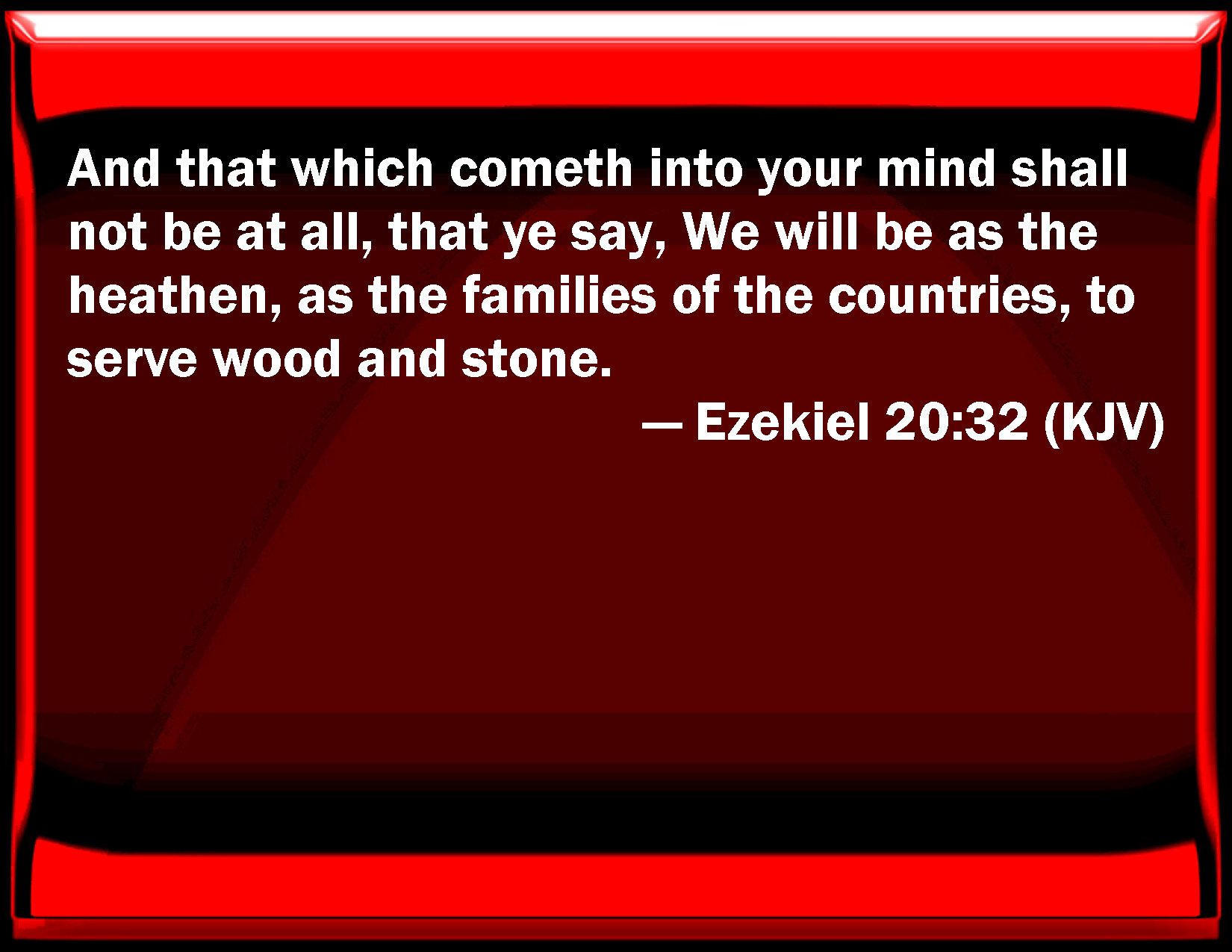 Bible Verse Slide Ezekiel 20:32 And that which comes into your mind shall not be at all, that you say, We will be as the heathen, as the families of the countries, to serve wood and stone. KJV: And that which cometh into your mind shall not be at all, that ye say, We will be as the heathen, as the families of the countries, to serve wood and stone. DRB: Neither shall the thought of your mind come to pass, by which you say: We will be as the Gentiles, and as the families of the earth, to worship stocks and stones. DBT: And that which cometh into your mind shall not be at all, that ye say, We will be as the nations, as the families of the countries, in serving wood and stone. ERV: and that which cometh into your mind shall not be at all; in that ye say, We will be as the nations, as the families of the countries, to serve wood and stone. WBT: And that which cometh into your mind shall not be at all, that ye say, We will be as the heathen, as the families of the countries, to serve wood and stone. WEB: and that which comes into your mind shall not be at all, in that you say, We will be as the nations, as the families of the countries, to serve wood and stone. YLT: And that which is going up on your mind, It is not at all — in that ye are saying: We will be as the nations, as the families of the lands, To serve wood and stone.Links Ezekiel 20:32 NIV • Ezekiel 20:32 NLT • Ezekiel 20:32 ESV • Ezekiel 20:32 NASB • Ezekiel 20:32 KJV • Ezekiel 20:32 Interlinear • Ezekiel 20:32 Commentaries • Ezekiel 20:32 Parallel Texts • Ezekiel 20:32 Bible Apps • Ezekiel 20:32 Parallel • Bible Hub |