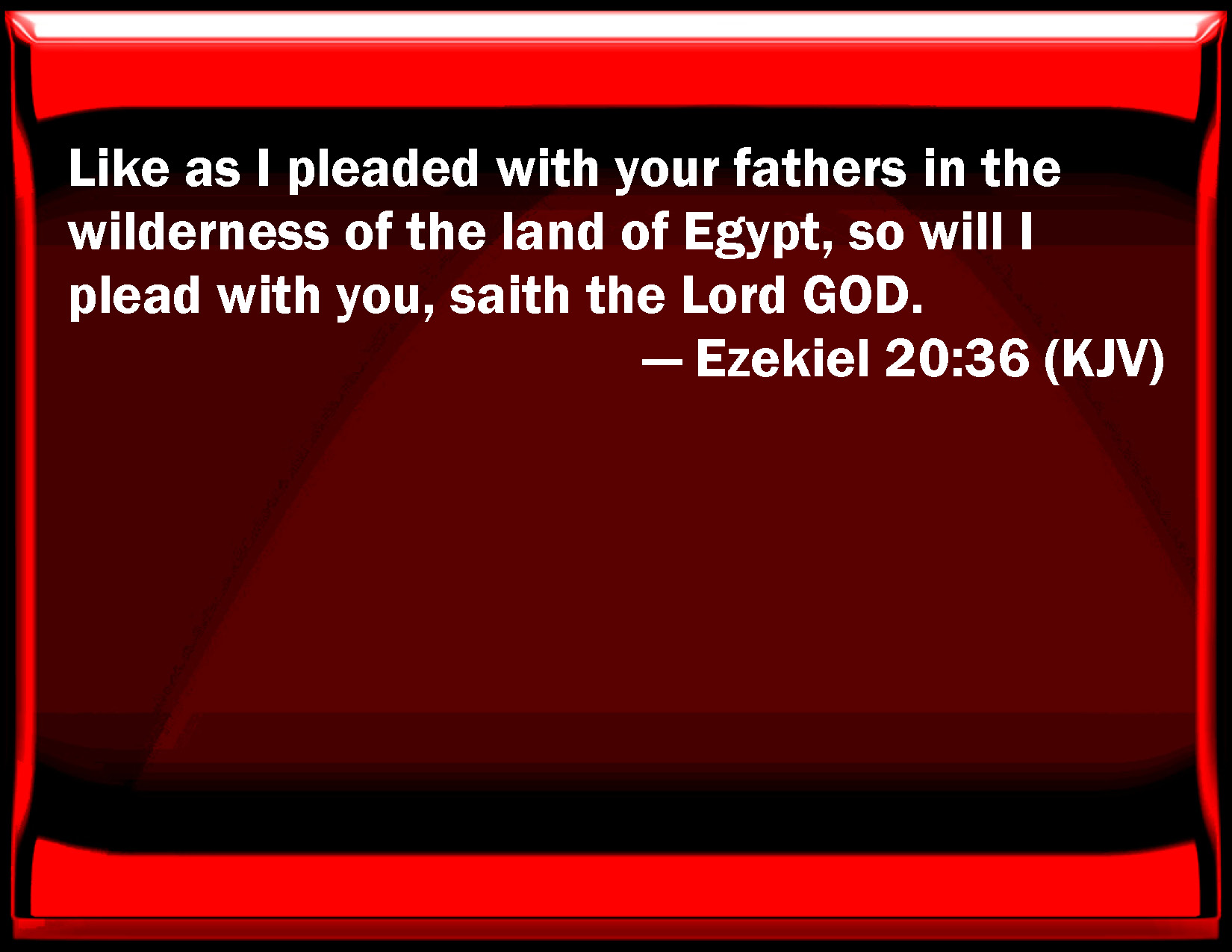 Bible Verse Slide Ezekiel 20:36 Like as I pleaded with your fathers in the wilderness of the land of Egypt, so will I plead with you, said the Lord GOD. KJV: Like as I pleaded with your fathers in the wilderness of the land of Egypt, so will I plead with you, saith the Lord GOD. DRB: As I pleaded against your fathers in the desert of the land of Egypt; even so will I judge you, saith the Lord God. DBT: Like as I entered into judgment with your fathers in the wilderness of the land of Egypt, so will I enter into judgment with you, saith the Lord Jehovah. ERV: Like as I pleaded with your fathers in the wilderness of the land of Egypt, so will I plead with you, saith the Lord GOD. WBT: As I pleaded with your fathers in the wilderness of the land of Egypt, so will I plead with you, saith the Lord GOD. WEB: Like as I entered into judgment with your fathers in the wilderness of the land of Egypt, so will I enter into judgment with you, says the Lord Yahweh. YLT: As I was judged with your fathers, In the wilderness of the land of Egypt, So I am judged with you, An affirmation of the Lord Jehovah.Links Ezekiel 20:36 NIV • Ezekiel 20:36 NLT • Ezekiel 20:36 ESV • Ezekiel 20:36 NASB • Ezekiel 20:36 KJV • Ezekiel 20:36 Interlinear • Ezekiel 20:36 Commentaries • Ezekiel 20:36 Parallel Texts • Ezekiel 20:36 Bible Apps • Ezekiel 20:36 Parallel • Bible Hub |