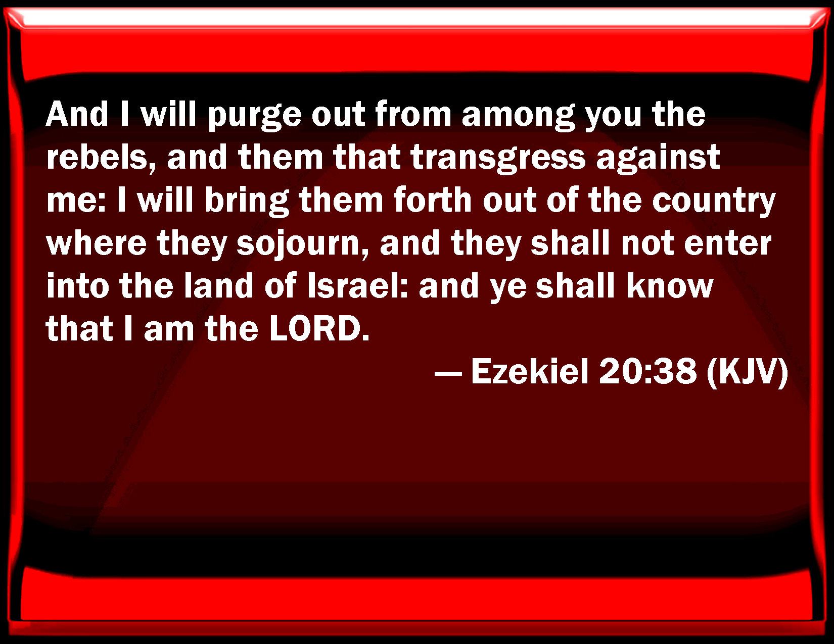 Bible Verse Slide Ezekiel 20:38 And I will purge out from among you the rebels, and them that transgress against me: I will bring them forth out of the country where they sojourn, and they shall not enter into the land of Israel: and you shall know that I am the LORD. KJV: And I will purge out from among you the rebels, and them that transgress against me: I will bring them forth out of the country where they sojourn, and they shall not enter into the land of Israel: and ye shall know that I am the LORD. DRB: And I will pick out from among you the transgressors, and the wicked, and will bring them out of the land where they sojourn, and they shall not enter into the land of Israel: and you shall know that I am the Lord. DBT: And I will purge out from among you the rebels, and them that transgress against me; I will bring them forth out of the country where they sojourn, but they shall not enter into the land of Israel: and ye shall know that I am Jehovah. ERV: and I will purge out from among you the rebels, and them that transgress against me; I will bring them forth out of the land where they sojourn, but they shall not enter into the land of Israel: and ye shall know that I am the LORD. WBT: And I will purge out from among you the rebels, and them that transgress against me: I will bring them forth out of the country where they sojourn, and they shall not enter into the land of Israel: and ye shall know that I am the LORD. WEB: and I will purge out from among you the rebels, and those who disobey against me; I will bring them forth out of the land where they live, but they shall not enter into the land of Israel: and you shall know that I am Yahweh. YLT: And cleared out from you the rebels, And them transgressing against Me, From the land of their sojournings I bring them out, And unto the land of Israel they come not, And ye have known that I am Jehovah.Links Ezekiel 20:38 NIV • Ezekiel 20:38 NLT • Ezekiel 20:38 ESV • Ezekiel 20:38 NASB • Ezekiel 20:38 KJV • Ezekiel 20:38 Interlinear • Ezekiel 20:38 Commentaries • Ezekiel 20:38 Parallel Texts • Ezekiel 20:38 Bible Apps • Ezekiel 20:38 Parallel • Bible Hub |