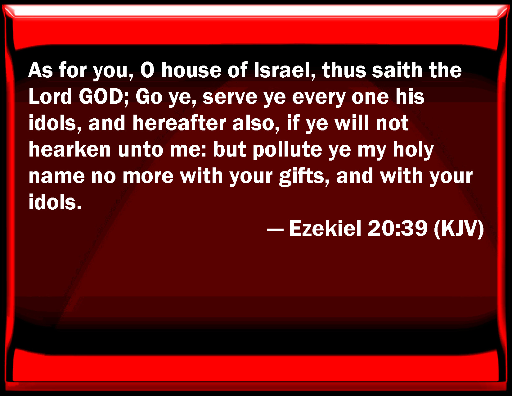 Bible Verse Slide Ezekiel 20:39 As for you, O house of Israel, thus said the Lord GOD; Go you, serve you every one his idols, and hereafter also, if you will not listen to me: but pollute you my holy name no more with your gifts, and with your idols. KJV: As for you, O house of Israel, thus saith the Lord GOD; Go ye, serve ye every one his idols, and hereafter also, if ye will not hearken unto me: but pollute ye my holy name no more with your gifts, and with your idols. DRB: And as for you, O house of Israel: thus saith the Lord God: Walk ye every one after your idols, and serve them. But if in this also you hear me not, but defile my holy name any more with your gifts, and with your idols; DBT: As for you, O house of Israel, thus saith the Lord Jehovah: Go ye, serve every one his idols henceforth also, if none of you will hearken unto me; but profane my holy name no more with your gifts and with your idols. ERV: As for you, O house of Israel, thus saith the Lord GOD: Go ye, serve every one his idols, and hereafter also, if ye will not hearken unto me: but my holy name shall ye no more profane with your gifts, and with your idols. WBT: As for you, O house of Israel, thus saith the Lord GOD; Go ye, serve ye every one his idols, and hereafter also, if ye will not hearken to me: but profane ye my holy name no more with your gifts, and with your idols. WEB: As for you, house of Israel, thus says the Lord Yahweh: Go, serve everyone his idols, and hereafter also, if you will not listen to me; but my holy name you shall no more profane with your gifts, and with your idols. YLT: And ye, O house of Israel, thus said the Lord Jehovah: Each his idols — go — serve ye, And, afterwards, if ye are not hearkening to me, And My holy name ye do not pollute any more by your gifts, and by your idols.Links Ezekiel 20:39 NIV • Ezekiel 20:39 NLT • Ezekiel 20:39 ESV • Ezekiel 20:39 NASB • Ezekiel 20:39 KJV • Ezekiel 20:39 Interlinear • Ezekiel 20:39 Commentaries • Ezekiel 20:39 Parallel Texts • Ezekiel 20:39 Bible Apps • Ezekiel 20:39 Parallel • Bible Hub |