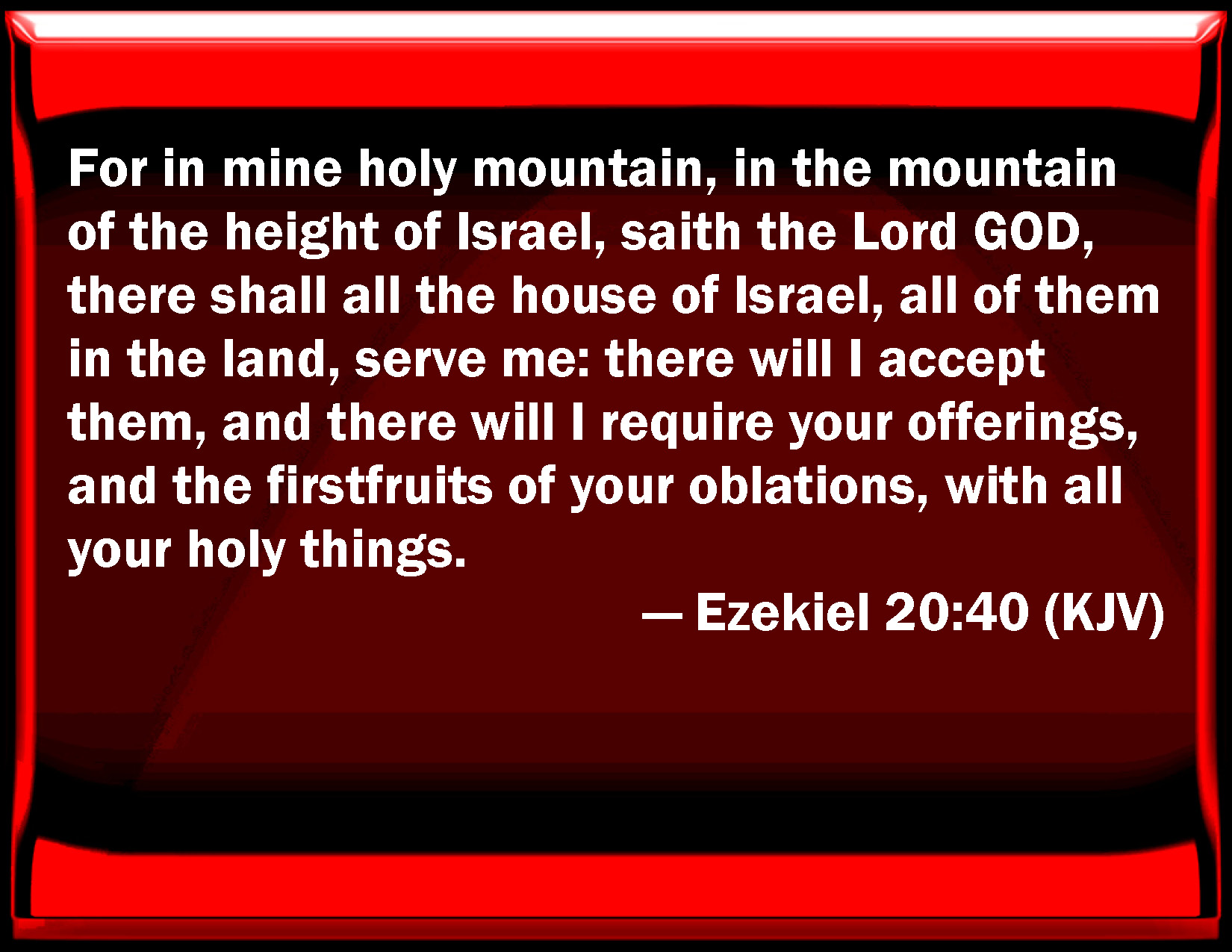 Bible Verse Slide Ezekiel 20:40 For in my holy mountain, in the mountain of the height of Israel, said the Lord GOD, there shall all the house of Israel, all of them in the land, serve me: there will I accept them, and there will I require your offerings, and the first fruits of your oblations, with all your holy things. KJV: For in mine holy mountain, in the mountain of the height of Israel, saith the Lord GOD, there shall all the house of Israel, all of them in the land, serve me: there will I accept them, and there will I require your offerings, and the firstfruits of your oblations, with all your holy things. DRB: In my holy mountain, in the high mountain of Israel, saith the Lord God, there shall all the house of Israel serve me; all of them I say, in the land in which they shall please me, and there will I require your firstfruits, and the chief of your tithes with all your sanctifications. DBT: For in my holy mountain, in the mountain of the height of Israel, saith the Lord Jehovah, there shall all the house of Israel serve me, the whole of it, in the land; there will I accept them, and there will I require your heave-offerings and the first-fruits of your offerings, with all your holy things. ERV: For in mine holy mountain, in the mountain of the height of Israel, saith the Lord GOD, there shall all the house of Israel, all of them, serve me in the land: there will I accept them, and there will I require your offerings, and the firstfruits of your oblations, with all your holy things. WBT: For on my holy mountain, on the mountain of the hight of Israel, saith the Lord GOD, there shall all the house of Israel, all of them in the land, serve me: there will I accept them, and there will I require your offerings, and the first fruits of your oblations, with all your holy things. WEB: For in my holy mountain, in the mountain of the height of Israel, says the Lord Yahweh, there shall all the house of Israel, all of them, serve me in the land: there will I accept them, and there will I require your offerings, and the first fruits of your offerings, with all your holy things. YLT: For, in My holy mountain, In the mountain of the height of Israel, An affirmation of the Lord Jehovah, There serve Me do all the house of Israel, All of it, in the land — there I accept them, And there I do seek your heave-offerings, And with the first-fruit of your gifts, With all your holy things.Links Ezekiel 20:40 NIV • Ezekiel 20:40 NLT • Ezekiel 20:40 ESV • Ezekiel 20:40 NASB • Ezekiel 20:40 KJV • Ezekiel 20:40 Interlinear • Ezekiel 20:40 Commentaries • Ezekiel 20:40 Parallel Texts • Ezekiel 20:40 Bible Apps • Ezekiel 20:40 Parallel • Bible Hub |