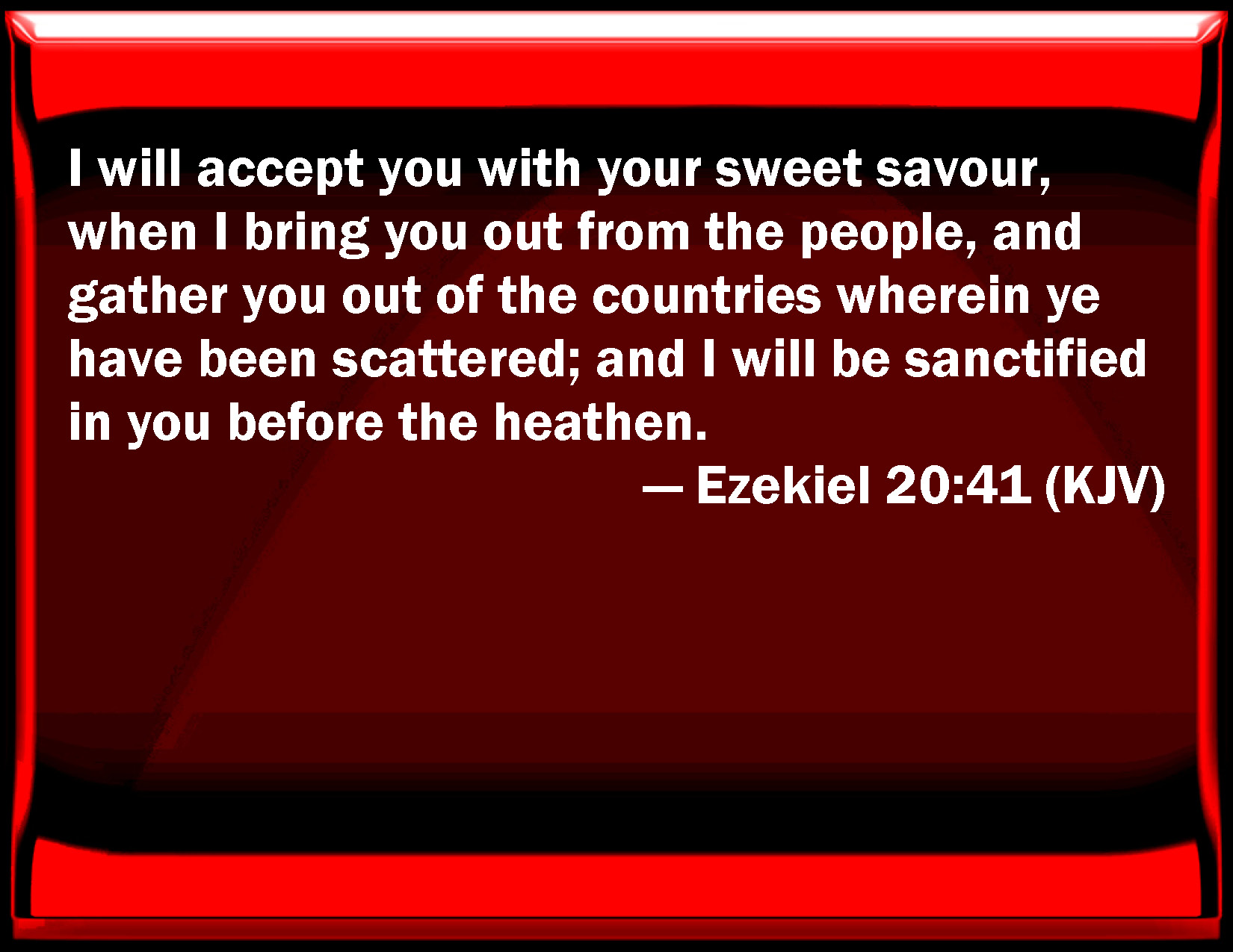 Bible Verse Slide Ezekiel 20:41 I will accept you with your sweet smell, when I bring you out from the people, and gather you out of the countries wherein you have been scattered; and I will be sanctified in you before the heathen. KJV: I will accept you with your sweet savour, when I bring you out from the people, and gather you out of the countries wherein ye have been scattered; and I will be sanctified in you before the heathen. DRB: I will accept of you for an odour of sweetness, when I shall have brought you out from the people, and shall have gathered you out of the lands into which you are scattered, and I will be sanctified in you in the sight of the nations. DBT: As a sweet savour will I accept you, when I bring you out from the peoples, and gather you out of the countries wherein ye have been scattered; and I will be hallowed in you in the sight of the nations. ERV: As a sweet savour will I accept you, when I bring you out from the peoples, and gather you out of the countries wherein ye have been scattered; and I will be sanctified in you in the sight of the nations. WBT: I will accept you with your sweet savor, when I bring you out from the people, and gather you out of the countries in which ye have been scattered; and I will be sanctified in you before the heathen. WEB: As a pleasant aroma will I accept you, when I bring you out from the peoples, and gather you out of the countries in which you have been scattered; and I will be sanctified in you in the sight of the nations. YLT: With sweet fragrance I do accept you, In My bringing you out from the peoples, And I have assembled you from the lands In which ye have been scattered, And I have been sanctified in you Before the eyes of the nations.Links Ezekiel 20:41 NIV • Ezekiel 20:41 NLT • Ezekiel 20:41 ESV • Ezekiel 20:41 NASB • Ezekiel 20:41 KJV • Ezekiel 20:41 Interlinear • Ezekiel 20:41 Commentaries • Ezekiel 20:41 Parallel Texts • Ezekiel 20:41 Bible Apps • Ezekiel 20:41 Parallel • Bible Hub |