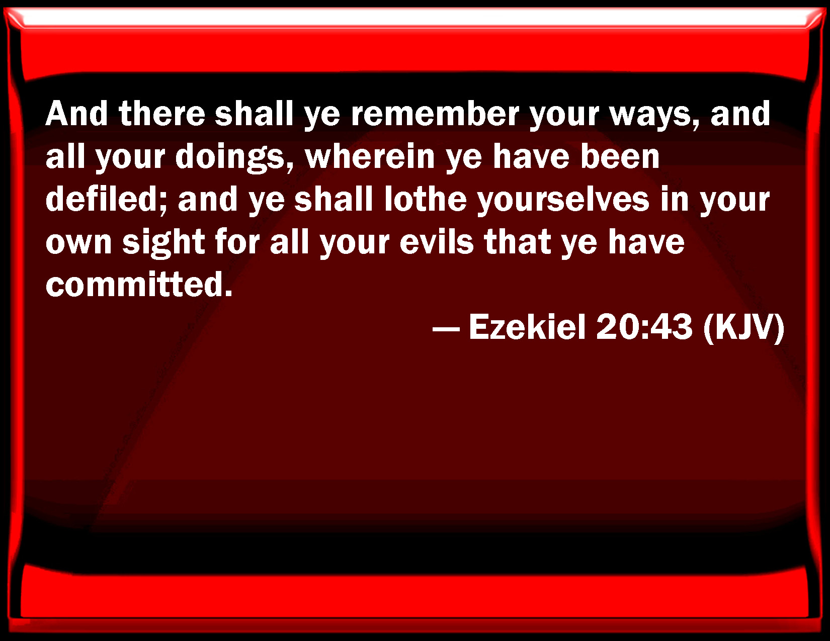 Bible Verse Slide Ezekiel 20:43 And there shall you remember your ways, and all your doings, wherein you have been defiled; and you shall loathe yourselves in your own sight for all your evils that you have committed. KJV: And there shall ye remember your ways, and all your doings, wherein ye have been defiled; and ye shall lothe yourselves in your own sight for all your evils that ye have committed. DRB: And there you shall remember your ways, and all your wicked doings with which you have been defiled; and you shall be displeased with yourselves in your own sight, for all your wicked deeds which you committed. DBT: And there shall ye remember your ways, and all your doings, wherein ye have been defiled; and ye shall loathe yourselves in your own sight for all your evils which ye have committed. ERV: And there shall ye remember your ways, and all your doings, wherein ye have polluted yourselves; and ye shall loathe yourselves in your own sight for all your evils that ye have committed. WBT: And there shall ye remember your ways, and all your doings in which ye have been defiled; and ye shall lothe yourselves in your own sight for all your evils that ye have committed. WEB: There you shall remember your ways, and all your doings, in which you have polluted yourselves; and you shall loathe yourselves in your own sight for all your evils that you have committed. YLT: And ye have remembered there your ways, And all your doings, In which ye have been defiled, And ye have been loathsome in your own faces, For all your evils that ye have done.Links Ezekiel 20:43 NIV • Ezekiel 20:43 NLT • Ezekiel 20:43 ESV • Ezekiel 20:43 NASB • Ezekiel 20:43 KJV • Ezekiel 20:43 Interlinear • Ezekiel 20:43 Commentaries • Ezekiel 20:43 Parallel Texts • Ezekiel 20:43 Bible Apps • Ezekiel 20:43 Parallel • Bible Hub |