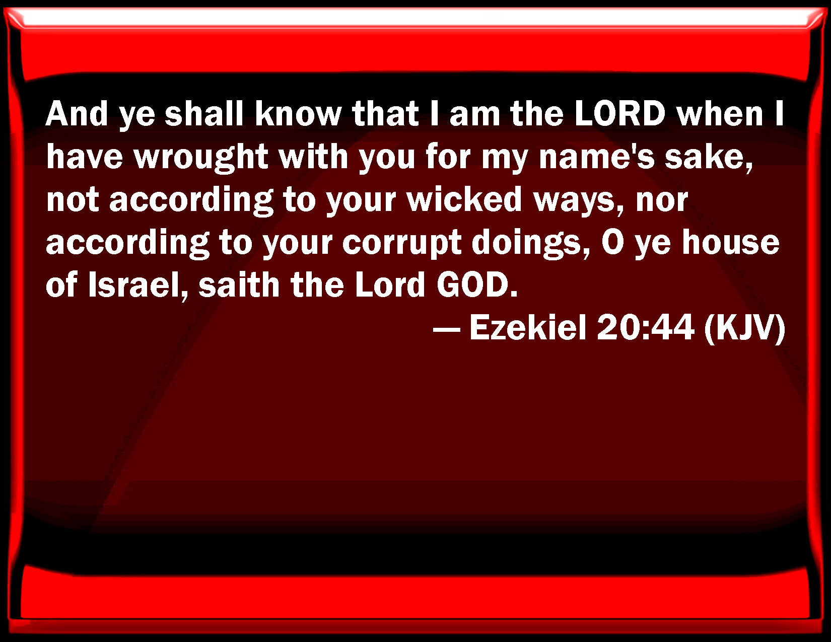 Bible Verse Slide Ezekiel 20:44 And you shall know that I am the LORD when I have worked with you for my name's sake, not according to your wicked ways, nor according to your corrupt doings, O you house of Israel, said the Lord GOD. KJV: And ye shall know that I am the LORD, when I have wrought with you for my name's sake, not according to your wicked ways, nor according to your corrupt doings, O ye house of Israel, saith the Lord GOD. DRB: And you shall know that I am the Lord, when I shall have done well by you for my own name's sake, and not according to your evil ways, nor according to your wicked deeds, O house of Israel, saith the Lord God. DBT: And ye shall know that I am Jehovah, when I have wrought with you for my name's sake, not according to your wicked ways, nor according to your corrupt doings, O house of Israel, saith the Lord Jehovah. ERV: And ye shall know that I am the LORD, when I have wrought with you for my name's sake, not according to your evil ways, nor according to your corrupt doings, O ye house of Israel, saith the Lord GOD. WBT: And ye shall know that I am the LORD, when I have wrought with you for my name's sake, not according to your wicked ways, nor according to your corrupt doings, O ye house of Israel, saith the Lord GOD. WEB: You shall know that I am Yahweh, when I have dealt with you for my name's sake, not according to your evil ways, nor according to your corrupt doings, you house of Israel, says the Lord Yahweh. YLT: And ye have known that I am Jehovah, In My dealing with you for My name's sake, Not according to your evil ways, And according to your corrupt doings, O house of Israel, An affirmation of the Lord Jehovah.'Links Ezekiel 20:44 NIV • Ezekiel 20:44 NLT • Ezekiel 20:44 ESV • Ezekiel 20:44 NASB • Ezekiel 20:44 KJV • Ezekiel 20:44 Interlinear • Ezekiel 20:44 Commentaries • Ezekiel 20:44 Parallel Texts • Ezekiel 20:44 Bible Apps • Ezekiel 20:44 Parallel • Bible Hub |