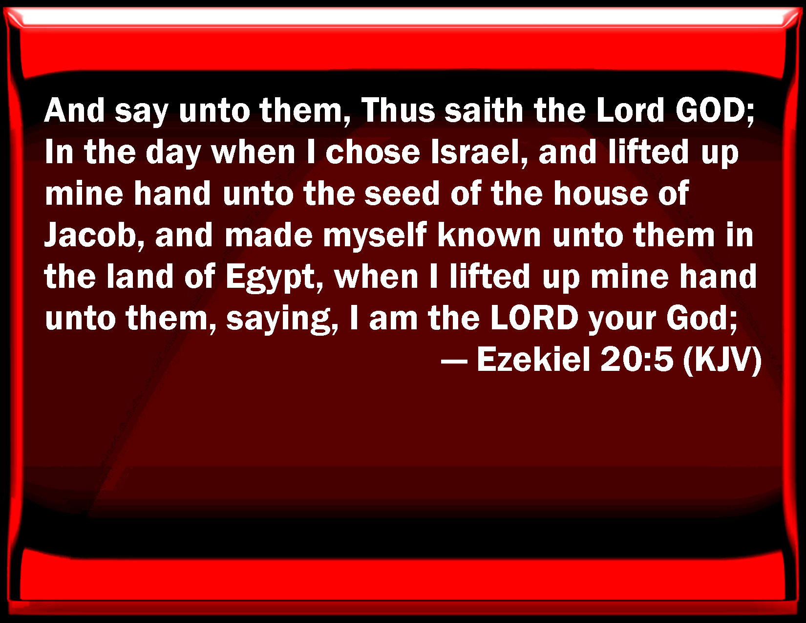 Bible Verse Slide Ezekiel 20:5 And say to them, Thus said the Lord GOD; In the day when I chose Israel, and lifted up my hand to the seed of the house of Jacob, and made myself known to them in the land of Egypt, when I lifted up my hand to them, saying, I am the LORD your God; KJV: And say unto them, Thus saith the Lord GOD; In the day when I chose Israel, and lifted up mine hand unto the seed of the house of Jacob, and made myself known unto them in the land of Egypt, when I lifted up mine hand unto them, saying, I am the LORD your God; DRB: And say to them: Thus saith the Lord God : In the day when I chose Israel, and lifted up my hand for the race of the house of Jacob: and appeared to them in the land of Egypt, and lifted up my hand for them, saying: I am the Lord your God: DBT: and say unto them, Thus saith the Lord Jehovah: In the day when I chose Israel, and lifted up my hand unto the seed of the house of Jacob, and made myself known unto them in the land of Egypt, when I lifted up my hand unto them, saying, I am Jehovah your God, ERV: and say unto them, Thus saith the Lord GOD: In the day when I chose Israel, and lifted up mine hand unto the seed of the house of Jacob, and made myself known unto them in the land of Egypt, when I lifted up mine hand unto them, Saying, I am the LORD your God; WBT: And say to them, Thus saith the Lord GOD; In the day when I chose Israel, and lifted up my hand to the seed of the house of Jacob, and made myself known to them in the land of Egypt, when I lifted up my hand to them, saying, I am the LORD your God; WEB: and tell them, Thus says the Lord Yahweh: In the day when I chose Israel, and swore to the seed of the house of Jacob, and made myself known to them in the land of Egypt, when I swore to them, saying, I am Yahweh your God; YLT: and thou hast said unto them: Thus said the Lord Jehovah: In the day of My fixing on Israel, I lift up My hand, To the seed of the house of Jacob, And am known to them in the land of Egypt, And I lift up My hand to them, Saying, I am Jehovah your God.Links Ezekiel 20:5 NIV • Ezekiel 20:5 NLT • Ezekiel 20:5 ESV • Ezekiel 20:5 NASB • Ezekiel 20:5 KJV • Ezekiel 20:5 Interlinear • Ezekiel 20:5 Commentaries • Ezekiel 20:5 Parallel Texts • Ezekiel 20:5 Bible Apps • Ezekiel 20:5 Parallel • Bible Hub |