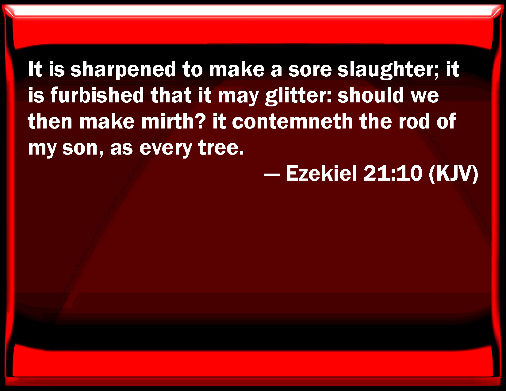 Bible Verse Slide Ezekiel 21:10 It is sharpened to make a sore slaughter; it is furbished that it may glitter: should we then make mirth? it scorns the rod of my son, as every tree. KJV: It is sharpened to make a sore slaughter; it is furbished that it may glitter: should we then make mirth? it contemneth the rod of my son, as every tree. DRB: It is sharpened to kill victims: it is furbished that it may glitter: thou removest the sceptre of my son, thou hast cut down every tree. DBT: It is sharpened for sore slaughter, it is furbished that it may glitter. Shall we then make mirth, saying, The sceptre of my son contemneth all wood? ERV: it is sharpened that it may make a slaughter; it is furbished that it may be as lightning: shall we then make mirth? the rod of my son, it contemneth every tree. WBT: It is sharpened to make a grievous slaughter; it is furbished that it may glitter: should we then make mirth? it contemneth the rod of my son, as every tree. WEB: it is sharpened that it may make a slaughter; it is furbished that it may be as lightning: shall we then make mirth? the rod of my son, it condemns every tree. YLT: So as to slaughter a slaughter it is sharpened. So as to have brightness it is polished, Desire hath rejoiced the sceptre of my son, It is despising every tree.Links Ezekiel 21:10 NIV • Ezekiel 21:10 NLT • Ezekiel 21:10 ESV • Ezekiel 21:10 NASB • Ezekiel 21:10 KJV • Ezekiel 21:10 Interlinear • Ezekiel 21:10 Commentaries • Ezekiel 21:10 Parallel Texts • Ezekiel 21:10 Bible Apps • Ezekiel 21:10 Parallel • Bible Hub |