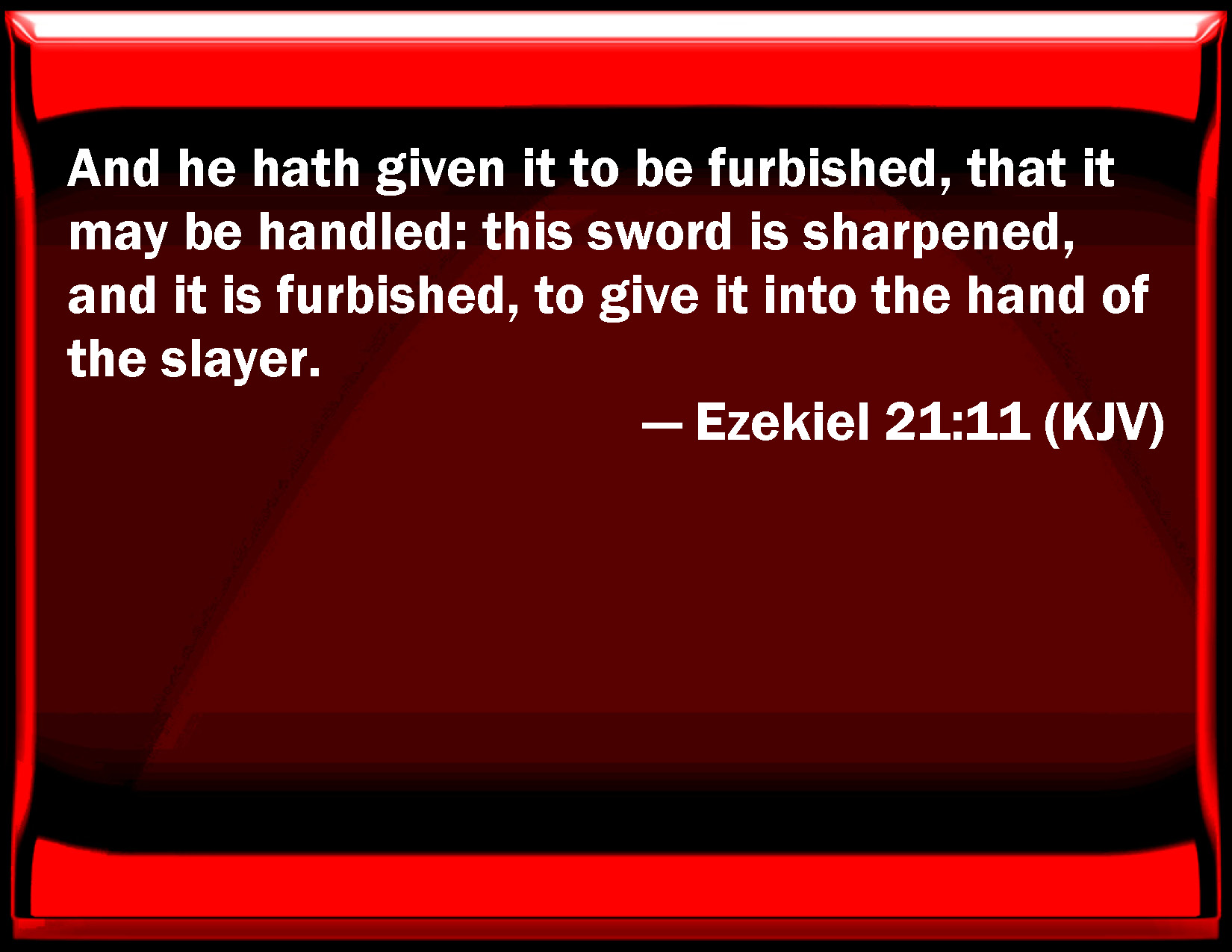 Bible Verse Slide Ezekiel 21:11 And he has given it to be furbished, that it may be handled: this sword is sharpened, and it is furbished, to give it into the hand of the slayer. KJV: And he hath given it to be furbished, that it may be handled: this sword is sharpened, and it is furbished, to give it into the hand of the slayer. DRB: And I have given it to be furbished, that it may be handled: this sword is sharpened, and it is furbished, that it may be in the hand of the slayer. DBT: And he hath given it to be furbished that it may be handled. The sword, it is sharpened, and it is furbished to give it into the hand of the slayer. ERV: And it is given to be furbished, that it may be handled: the sword, it is sharpened, yea, it is furbished, to give it into the hand of the slayer. WBT: And he hath given it to be furbished, that it may be handled: the sword is sharpened, and it is furbished, to give it into the hand of the slayer. WEB: It is given to be furbished, that it may be handled: the sword, it is sharpened, yes, it is furbished, to give it into the hand of the killer. YLT: And he giveth it for polishing, For laying hold of by the hand. It is sharpened — the sword — and polished, To give it into the hand of a slayer.Links Ezekiel 21:11 NIV • Ezekiel 21:11 NLT • Ezekiel 21:11 ESV • Ezekiel 21:11 NASB • Ezekiel 21:11 KJV • Ezekiel 21:11 Interlinear • Ezekiel 21:11 Commentaries • Ezekiel 21:11 Parallel Texts • Ezekiel 21:11 Bible Apps • Ezekiel 21:11 Parallel • Bible Hub |