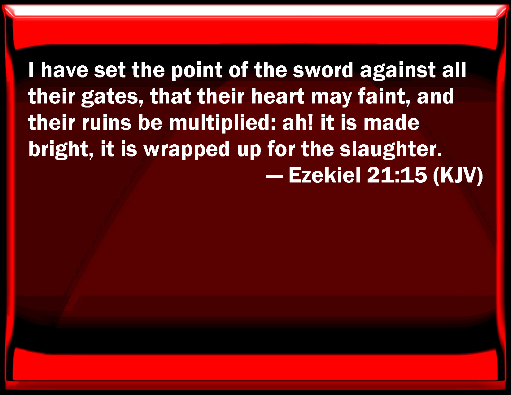Bible Verse Slide Ezekiel 21:15 I have set the point of the sword against all their gates, that their heart may faint, and their ruins be multiplied: ah! it is made bright, it is wrapped up for the slaughter. KJV: I have set the point of the sword against all their gates, that their heart may faint, and their ruins be multiplied: ah! it is made bright, it is wrapped up for the slaughter. DRB: And languish in heart, and that multiplieth ruins. In all their gates I have set the dread of the sharp sword, the sword that is furbished to glitter, that is made ready for slaughter. DBT: In order that the heart may melt, and the stumbling-blocks be multiplied, I have set the threatening sword against all their gates: ah! it is made glittering, it is whetted for the slaughter. ERV: I have set the point of the sword against all their gates, that their heart may melt, and their stumblings be multiplied: ah! it is made as lightning, it is pointed for slaughter. WBT: I have set the point of the sword against all their gates, that their heart may faint, and their ruins be multiplied: ah! it is made bright, it is sharpened for the slaughter. WEB: I have set the threatening sword against all their gates, that their heart may melt, and their stumblings be multiplied: ah! it is made as lightning, it is pointed for slaughter. YLT: To melt the heart, and to multiply the ruins, By all their gates I have set the point of a sword. Ah, it is made for brightness, Wrapped up for slaughter.Links Ezekiel 21:15 NIV • Ezekiel 21:15 NLT • Ezekiel 21:15 ESV • Ezekiel 21:15 NASB • Ezekiel 21:15 KJV • Ezekiel 21:15 Interlinear • Ezekiel 21:15 Commentaries • Ezekiel 21:15 Parallel Texts • Ezekiel 21:15 Bible Apps • Ezekiel 21:15 Parallel • Bible Hub |