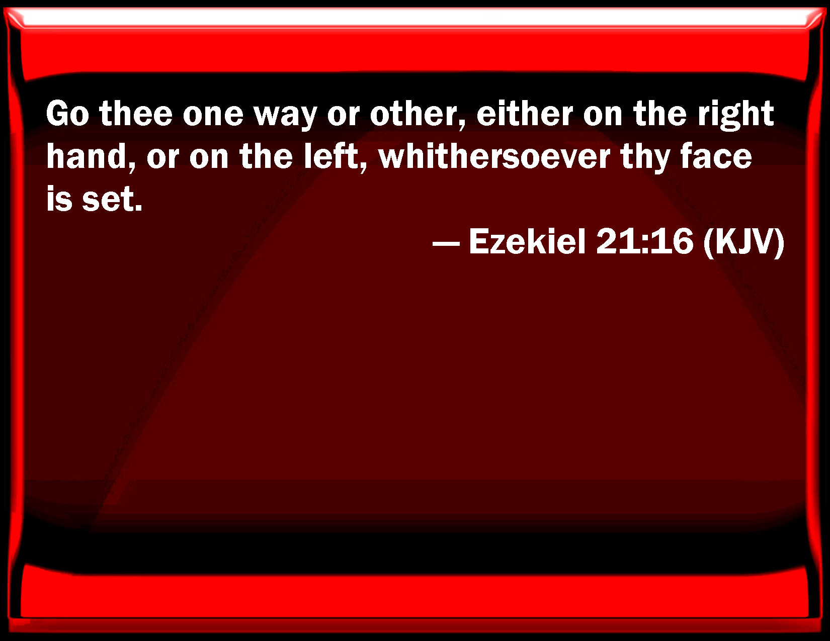 Bible Verse Slide Ezekiel 21:16 Go you one way or other, either on the right hand, or on the left, wherever your face is set. KJV: Go thee one way or other, either on the right hand, or on the left, whithersoever thy face is set. DRB: Be thou sharpened, go to the right hand, or to the left, which way soever thou hast a mind to set thy face. DBT: Gather up strength, go to the right hand, turn thee, go to the left, whithersoever thy face is appointed. ERV: Gather thee together, go to the right; set thyself in array, go to the left; whithersoever thy face is set. WBT: Go thee one way or other, either on the right hand, or on the left, whithersoever thy face is set. WEB: Gather yourselves together, go to the right, set yourselves in array, go to the left, wherever your face is set. YLT: Take possession of the right, place thyself at the left, Whither thy face is appointed.Links Ezekiel 21:16 NIV • Ezekiel 21:16 NLT • Ezekiel 21:16 ESV • Ezekiel 21:16 NASB • Ezekiel 21:16 KJV • Ezekiel 21:16 Interlinear • Ezekiel 21:16 Commentaries • Ezekiel 21:16 Parallel Texts • Ezekiel 21:16 Bible Apps • Ezekiel 21:16 Parallel • Bible Hub |