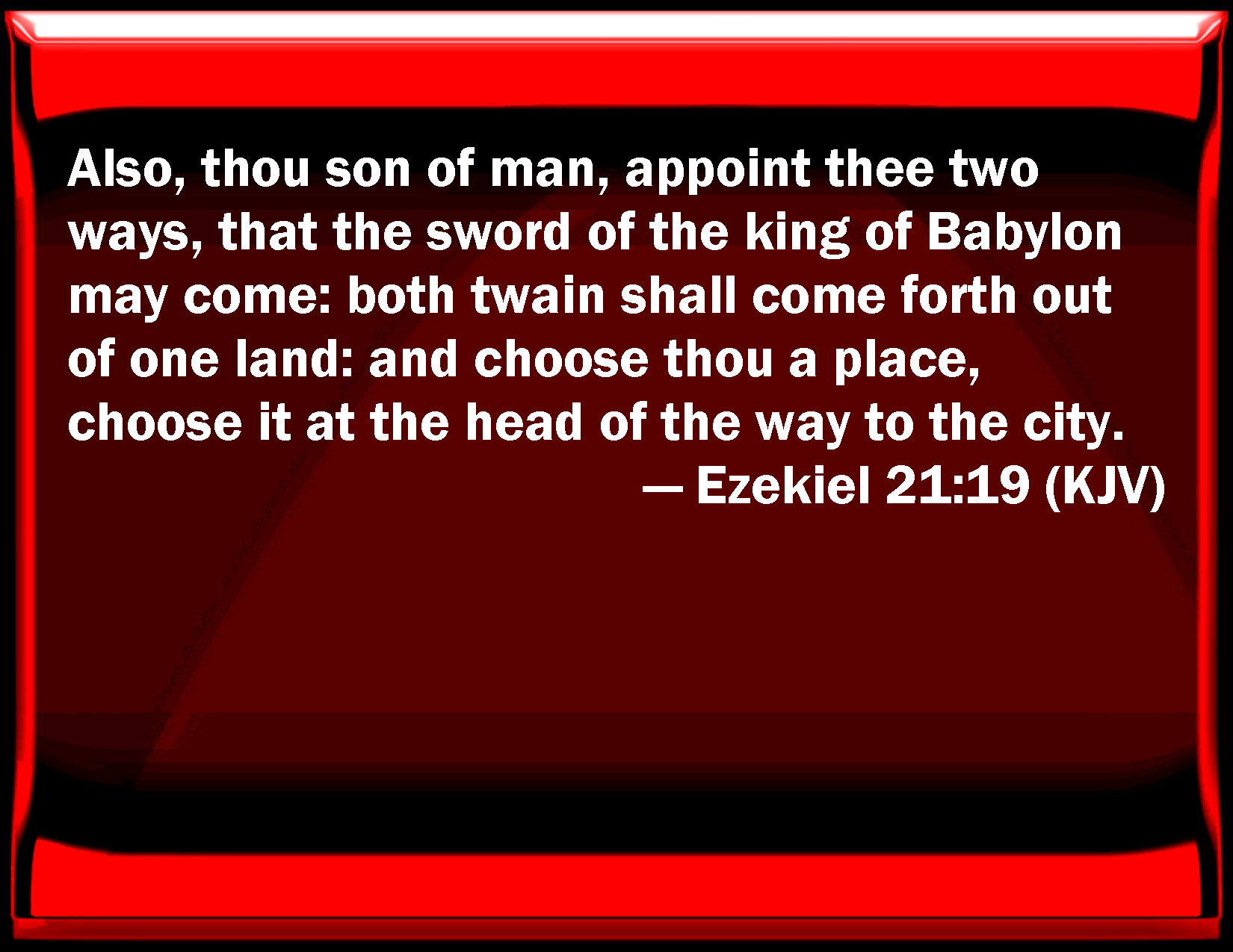 Bible Verse Slide Ezekiel 21:19 Also, you son of man, appoint you two ways, that the sword of the king of Babylon may come: both two shall come forth out of one land: and choose you a place, choose it at the head of the way to the city. KJV: Also, thou son of man, appoint thee two ways, that the sword of the king of Babylon may come: both twain shall come forth out of one land: and choose thou a place, choose it at the head of the way to the city. DRB: And thou son of man, set thee two ways, for the sword of the king of Babylon to come: both shall come forth out of one land: and with his hand he shall draw lots, he shall consult at the head of the way of the city. DBT: And thou, son of man, set thee two ways, by which the sword of the king of Babylon may come out of one land shall they both come and make thee a signpost, make it at the head of the way to the city. ERV: Also, thou son of man, appoint thee two ways, that the sword of the king of Babylon may come; they twain shall come forth out of one land: and mark out a place, mark it out at the head of the way to the city. WBT: Also, thou son of man, appoint thee two ways, that the sword of the king of Babylon may come: both ways shall come forth from one land: and choose thou a place, choose it at the head of the way to the city. WEB: Also, you son of man, appoint two ways, that the sword of the king of Babylon may come; they both shall come forth out of one land: and mark out a place, mark it out at the head of the way to the city. YLT: And thou, son of man, appoint for thee two ways, for the coming in of the sword of the king of Babylon; from one land they come forth, both of them, and a station prepare thou, at the top of the way of the city prepare it.Links Ezekiel 21:19 NIV • Ezekiel 21:19 NLT • Ezekiel 21:19 ESV • Ezekiel 21:19 NASB • Ezekiel 21:19 KJV • Ezekiel 21:19 Interlinear • Ezekiel 21:19 Commentaries • Ezekiel 21:19 Parallel Texts • Ezekiel 21:19 Bible Apps • Ezekiel 21:19 Parallel • Bible Hub |