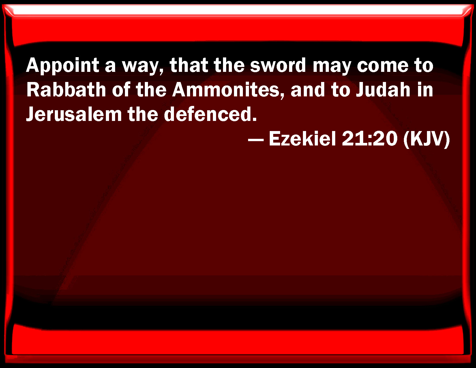 Bible Verse Slide Ezekiel 21:20 Appoint a way, that the sword may come to Rabbath of the Ammonites, and to Judah in Jerusalem the defended. KJV: Appoint a way, that the sword may come to Rabbath of the Ammonites, and to Judah in Jerusalem the defenced. DRB: Thou shalt make a way that the sword may come to Rabbath of the children of Ammon, and to Juda unto Jerusalem the strong city. DBT: Appoint a way for the coming of the sword to Rabbah of the children of Ammon, and to Judah at the fenced city of Jerusalem. ERV: Thou shalt appoint a way, for the sword to come to Rabbah of the children of Ammon, and to Judah in Jerusalem the defenced. WBT: Appoint a way, that the sword may come to Rabbah of the Ammonites, and to Judah in Jerusalem the fortified. WEB: You shall appoint a way for the sword to come to Rabbah of the children of Ammon, and to Judah in Jerusalem the fortified. YLT: A way appoint for the coming of the sword, Unto Rabbath of the sons of Ammon, And to Judah, in Jerusalem — the fenced.Links Ezekiel 21:20 NIV • Ezekiel 21:20 NLT • Ezekiel 21:20 ESV • Ezekiel 21:20 NASB • Ezekiel 21:20 KJV • Ezekiel 21:20 Interlinear • Ezekiel 21:20 Commentaries • Ezekiel 21:20 Parallel Texts • Ezekiel 21:20 Bible Apps • Ezekiel 21:20 Parallel • Bible Hub |