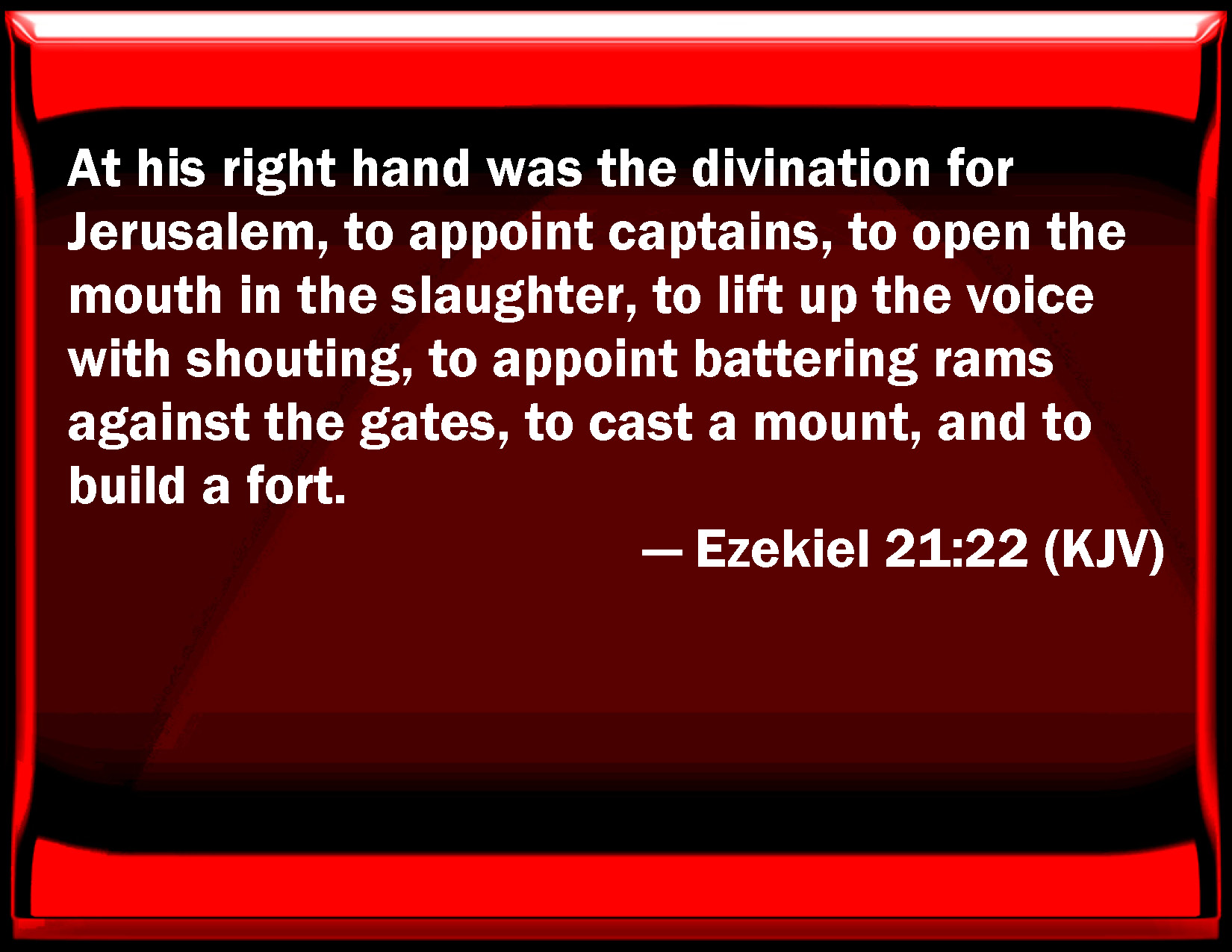 Bible Verse Slide Ezekiel 21:22 At his right hand was the divination for Jerusalem, to appoint captains, to open the mouth in the slaughter, to lift up the voice with shouting, to appoint battering rams against the gates, to cast a mount, and to build a fort. KJV: At his right hand was the divination for Jerusalem, to appoint captains, to open the mouth in the slaughter, to lift up the voice with shouting, to appoint battering rams against the gates, to cast a mount, and to build a fort. DRB: On his right hand was the divination for Jerusalem, to set battering rams, to open the mouth in slaughter, to lift up the voice in howling, to set engines against the gates, to cast up a mount, to build forts. DBT: In his right hand is the lot of Jerusalem to appoint battering-rams, to open the mouth for bloodshed, to lift up the voice with shouting, to appoint battering-rams against the gates, to cast mounds, to build siege-towers. ERV: In his right hand was the divination for Jerusalem, to set battering rams, to open the mouth in the slaughter, to lift up the voice with shouting, to set battering rams against the gates, to cast up mounts, to build forts. WBT: At his right hand was the divination for Jerusalem, to appoint captains, to open the mouth in the slaughter, to lift up the voice with shouting, to appoint battering rams against the gates, to cast a mount, and to build a fort. WEB: In his right hand was the divination [for] Jerusalem, to set battering rams, to open the mouth in the slaughter, to lift up the voice with shouting, to set battering rams against the gates, to cast up mounds, to build forts. YLT: At his right hath been the divination — Jerusalem, To place battering-rams, To open the mouth with slaughter, To lift up a voice with shouting, To place battering-rams against the gates, To pour out a mount, to build a fortification.Links Ezekiel 21:22 NIV • Ezekiel 21:22 NLT • Ezekiel 21:22 ESV • Ezekiel 21:22 NASB • Ezekiel 21:22 KJV • Ezekiel 21:22 Interlinear • Ezekiel 21:22 Commentaries • Ezekiel 21:22 Parallel Texts • Ezekiel 21:22 Bible Apps • Ezekiel 21:22 Parallel • Bible Hub |