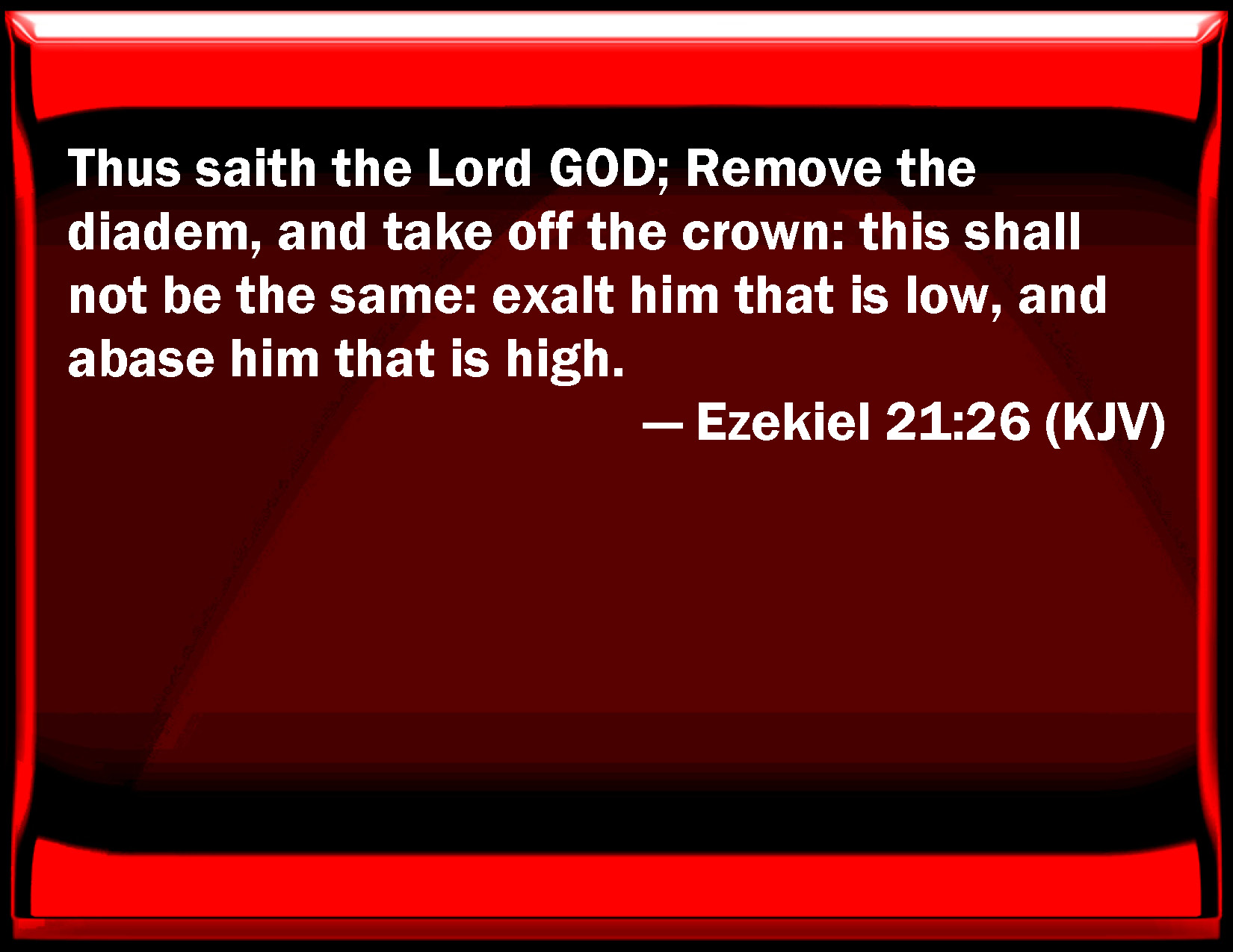 Bible Verse Slide Ezekiel 21:26 Thus said the Lord GOD; Remove the diadem, and take off the crown: this shall not be the same: exalt him that is low, and abase him that is high. KJV: Thus saith the Lord GOD; Remove the diadem, and take off the crown: this shall not be the same: exalt him that is low, and abase him that is high. DRB: Thus saith the Lord God: Remove the diadem, take off the crown: is it not this that hath exalted the low one, and brought down him that was high? DBT: thus saith the Lord Jehovah: Remove the mitre and take off the crown; what is shall be no more. Exalt that which is low, and abase that which is high. ERV: thus saith the Lord GOD: Remove the mitre, and take off the crown: this shall be no more the same: exalt that which is low, and abase that which is high. WBT: Thus saith the Lord GOD; Remove the diadem, and take off the crown: this shall not be the same: exalt him that is low, and abase him that is high. WEB: thus says the Lord Yahweh: Remove the turban, and take off the crown; this [shall be] no more the same; exalt that which is low, and abase that which is high. YLT: Thus said the Lord Jehovah: Turn aside the mitre, and bear away the crown, This — not this — the low make high, And the high make low.Links Ezekiel 21:26 NIV • Ezekiel 21:26 NLT • Ezekiel 21:26 ESV • Ezekiel 21:26 NASB • Ezekiel 21:26 KJV • Ezekiel 21:26 Interlinear • Ezekiel 21:26 Commentaries • Ezekiel 21:26 Parallel Texts • Ezekiel 21:26 Bible Apps • Ezekiel 21:26 Parallel • Bible Hub |