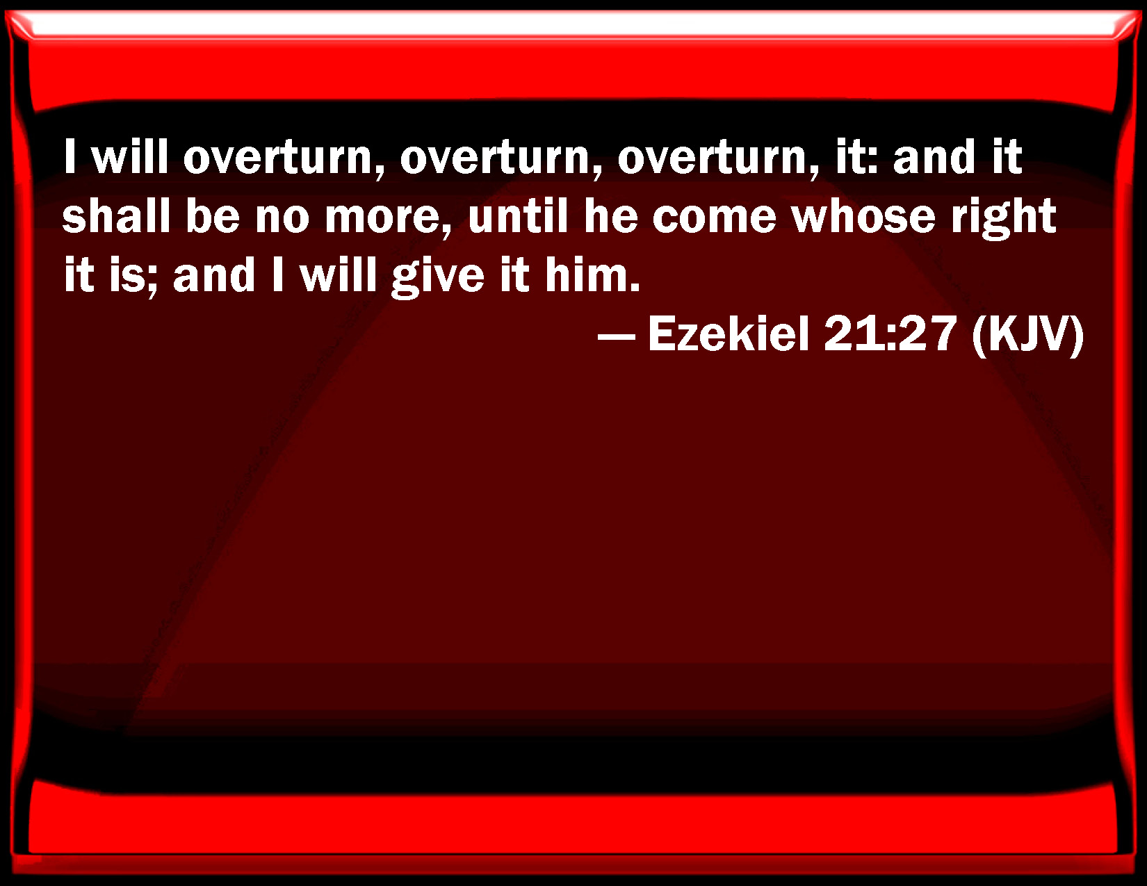 Bible Verse Slide Ezekiel 21:27 I will overturn, overturn, overturn, it: and it shall be no more, until he come whose right it is; and I will give it him. KJV: I will overturn, overturn, overturn, it: and it shall be no more, until he come whose right it is; and I will give it him. DRB: I will shew it to be iniquity, iniquity, iniquity: but this was not done till he came to whom judgment belongeth, and I will give it him. DBT: I will overturn, overturn, overturn it! This also shall be no more, until he come whose right it is; and I will give it to him. ERV: I will overturn, overturn, overturn it: this also shall be no more, until he come whose right it is; and I will give it him. WBT: I will overturn, overturn, overturn it: and it shall be no more, until he cometh whose right it is; and I will give it him. WEB: I will overturn, overturn, overturn it: this also shall be no more, until he come whose right it is; and I will give it [him]. YLT: An overturn, overturn, overturn, I make it, Also this hath not been till the coming of Him, Whose is the judgment, and I have given it.Links Ezekiel 21:27 NIV • Ezekiel 21:27 NLT • Ezekiel 21:27 ESV • Ezekiel 21:27 NASB • Ezekiel 21:27 KJV • Ezekiel 21:27 Interlinear • Ezekiel 21:27 Commentaries • Ezekiel 21:27 Parallel Texts • Ezekiel 21:27 Bible Apps • Ezekiel 21:27 Parallel • Bible Hub |