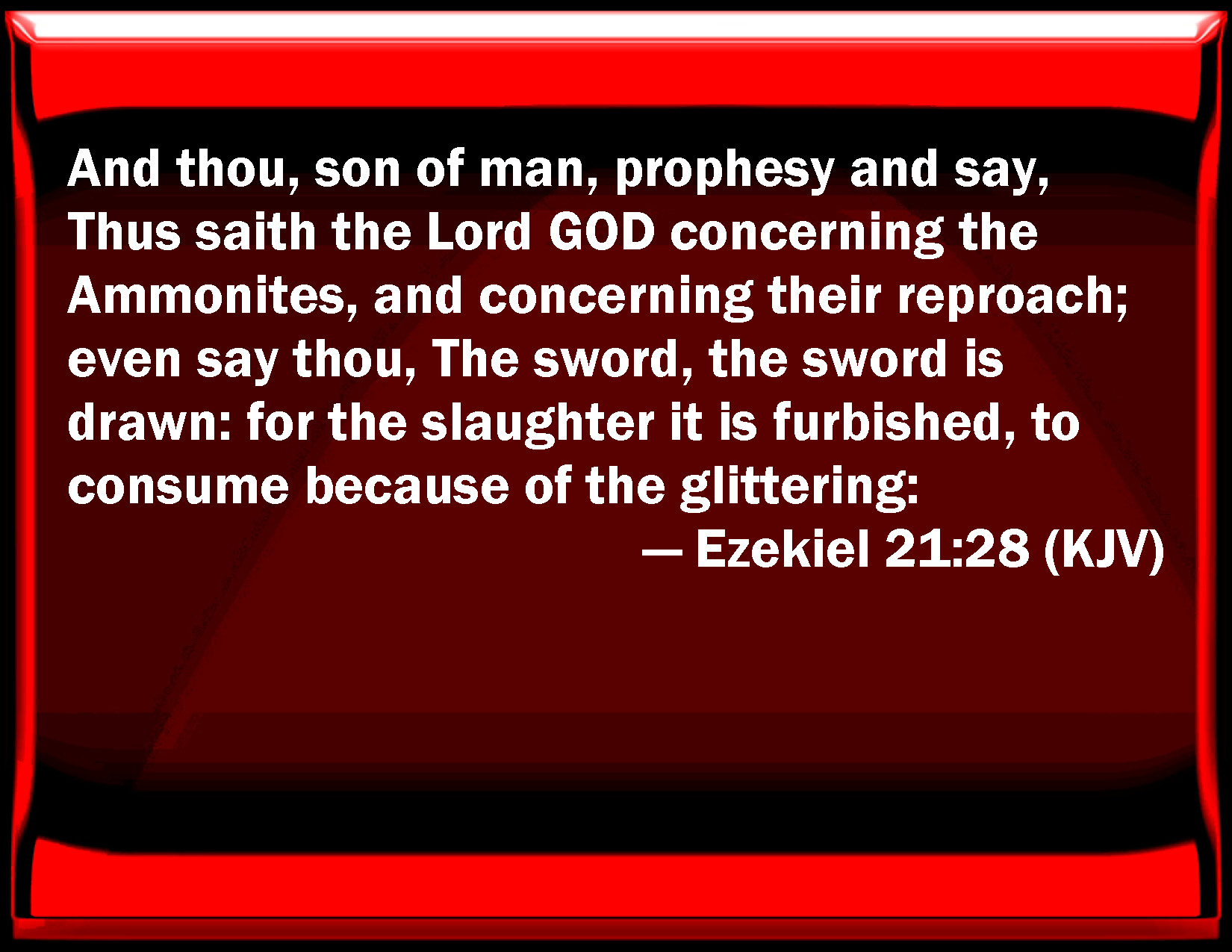 Bible Verse Slide Ezekiel 21:28 And you, son of man, prophesy and say, Thus said the Lord GOD concerning the Ammonites, and concerning their reproach; even say you, The sword, the sword is drawn: for the slaughter it is furbished, to consume because of the glittering: KJV: And thou, son of man, prophesy and say, Thus saith the Lord GOD concerning the Ammonites, and concerning their reproach; even say thou, The sword, the sword is drawn: for the slaughter it is furbished, to consume because of the glittering: DRB: And thou son of man, prophesy, and say: Thus saith the Lord God concerning the children of Ammon, and concerning their reproach, and thou shalt say: sword, O sword, come out of the scabbard to kill, be furbished to destroy, and to glitter, DBT: And thou, son of man, prophesy and say, Thus speaketh the Lord Jehovah concerning the children of Ammon, and concerning their reproach; and thou shalt say, A sword, a sword is drawn; for the slaughter is it furbished, that it may consume, that it may glitter: ERV: And thou, son of man, prophesy, and say, Thus saith the Lord GOD concerning the children of Ammon, and concerning their reproach; and say thou, A sword, a sword is drawn, for the slaughter it is furbished, to cause it to devour, that it may be as lightning: WBT: And thou, son of man, prophesy and say, Thus saith the Lord GOD concerning the Ammonites, and concerning their reproach; even say thou, The sword, the sword is drawn: for the slaughter it is furbished, to consume because of the glittering: WEB: You, son of man, prophesy, and say, Thus says the Lord Yahweh concerning the children of Ammon, and concerning their reproach; and say, A sword, a sword is drawn, for the slaughter it is furbished, to cause it to devour, that it may be as lightning; YLT: And thou, son of man, prophesy, and thou hast said: Thus said the Lord Jehovah concerning the sons of Ammon, and concerning their reproach: and thou hast said: A sword, a sword, open for slaughter, Polished to the utmost for brightness!Links Ezekiel 21:28 NIV • Ezekiel 21:28 NLT • Ezekiel 21:28 ESV • Ezekiel 21:28 NASB • Ezekiel 21:28 KJV • Ezekiel 21:28 Interlinear • Ezekiel 21:28 Commentaries • Ezekiel 21:28 Parallel Texts • Ezekiel 21:28 Bible Apps • Ezekiel 21:28 Parallel • Bible Hub |