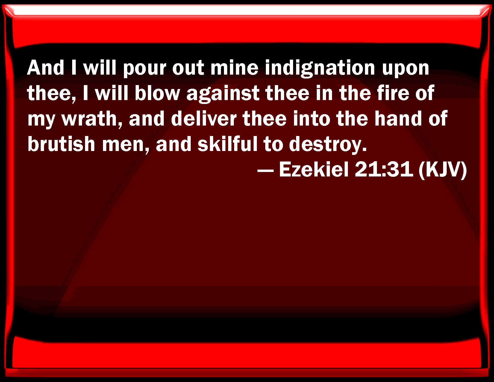 Bible Verse Slide Ezekiel 21:31 And I will pour out my indignation on you, I will blow against you in the fire of my wrath, and deliver you into the hand of brutish men, and skillful to destroy. KJV: And I will pour out mine indignation upon thee, I will blow against thee in the fire of my wrath, and deliver thee into the hand of brutish men, and skilful to destroy. DRB: And I will pour out upon thee my indignation: in the fire of my rage will I blow upon thee, and will give thee into the hands of men that are brutish and contrive thy destruction. DBT: And I will pour out mine indignation upon thee, I will blow upon thee the fire of my wrath, and give thee into the hand of brutish men, skilful to destroy. ERV: And I will pour out mine indignation upon thee; I will blow upon thee with the fire of my wrath: and I will deliver thee into the hand of brutish men, skilful to destroy. WBT: And I will pour out my indignation upon thee, I will blow against thee in the fire of my wrath, and deliver thee into the hand of brutish men, and skillful to destroy. WEB: I will pour out my indignation on you; I will blow on you with the fire of my wrath; and I will deliver you into the hand of brutish men, skillful to destroy. YLT: And I have poured on thee Mine indignation, With fire of My wrath I blow against thee, And have given thee into the hand of brutish men — artificers of destruction.Links Ezekiel 21:31 NIV • Ezekiel 21:31 NLT • Ezekiel 21:31 ESV • Ezekiel 21:31 NASB • Ezekiel 21:31 KJV • Ezekiel 21:31 Interlinear • Ezekiel 21:31 Commentaries • Ezekiel 21:31 Parallel Texts • Ezekiel 21:31 Bible Apps • Ezekiel 21:31 Parallel • Bible Hub |