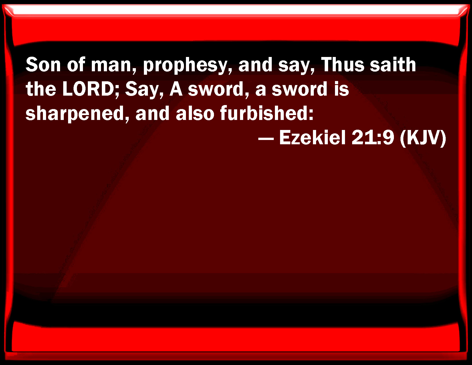 Bible Verse Slide Ezekiel 21:9 Son of man, prophesy, and say, Thus said the LORD; Say, A sword, a sword is sharpened, and also furbished: KJV: Son of man, prophesy, and say, Thus saith the LORD; Say, A sword, a sword is sharpened, and also furbished: DRB: Son of man, prophesy, and say: Thus saith the Lord God: Say: The sword, the sword is sharpened, and furbished. DBT: Son of man, prophesy, and say, Thus saith Jehovah: Say, A sword, a sword is sharpened, and also furbished. ERV: Son of man, prophesy, and say, Thus saith the LORD: Say, A sword, a sword, it is sharpened, and also furbished: WBT: Son of man, prophesy, and say, Thus saith the LORD; Say, A sword, a sword is sharpened, and also furbished: WEB: Son of man, prophesy, and say, Thus says Yahweh: Say, A sword, a sword, it is sharpened, and also furbished; YLT: 'Son of man, prophesy, and thou hast said, Thus said Jehovah, say: A sword, a sword is sharpened, and also polished.Links Ezekiel 21:9 NIV • Ezekiel 21:9 NLT • Ezekiel 21:9 ESV • Ezekiel 21:9 NASB • Ezekiel 21:9 KJV • Ezekiel 21:9 Interlinear • Ezekiel 21:9 Commentaries • Ezekiel 21:9 Parallel Texts • Ezekiel 21:9 Bible Apps • Ezekiel 21:9 Parallel • Bible Hub |
