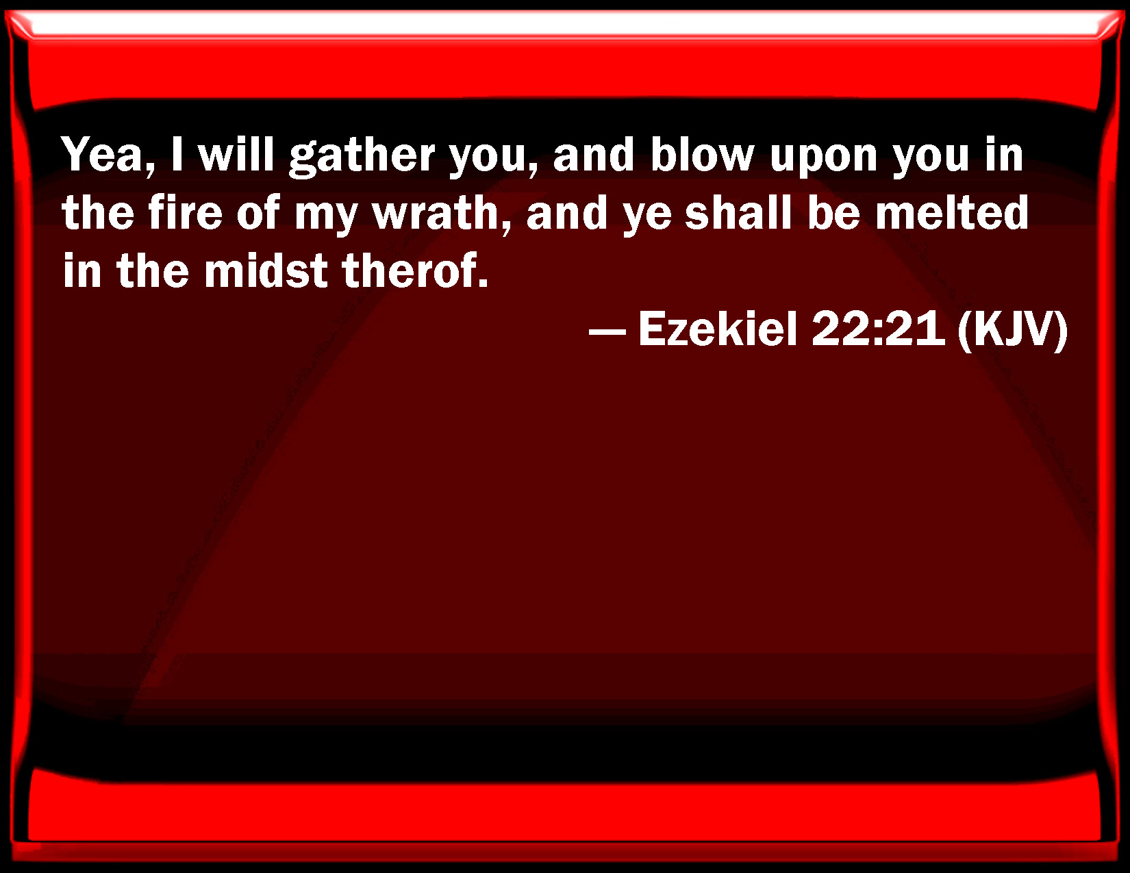 Bible Verse Slide Ezekiel 22:21 Yes, I will gather you, and blow on you in the fire of my wrath, and you shall be melted in the middle therof. KJV: Yea, I will gather you, and blow upon you in the fire of my wrath, and ye shall be melted in the midst thereof. DRB: And I will gather you together, and will burn you in the fire of my wrath, and you shall be melted in the midst thereof. DBT: Yea, I will collect you, and blow upon you the fire of my wrath, and ye shall be melted in the midst thereof. ERV: Yea, I will gather you, and blow upon you with the fire of my wrath, and ye shalt be melted in the midst thereof. WBT: Yes, I will gather you, and blow upon you in the fire of my wrath, and ye shall be melted in the midst of it. WEB: Yes, I will gather you, and blow on you with the fire of my wrath, and you shall be melted in its midst. YLT: And I have heaped you up, And blown on you in the fire of My wrath, And ye have been melted in its midst.Links Ezekiel 22:21 NIV • Ezekiel 22:21 NLT • Ezekiel 22:21 ESV • Ezekiel 22:21 NASB • Ezekiel 22:21 KJV • Ezekiel 22:21 Interlinear • Ezekiel 22:21 Commentaries • Ezekiel 22:21 Parallel Texts • Ezekiel 22:21 Bible Apps • Ezekiel 22:21 Parallel • Bible Hub |