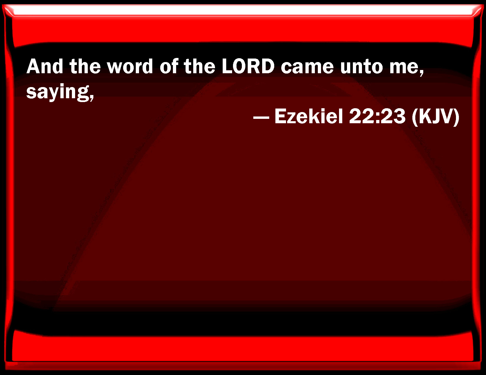 Bible Verse Slide Ezekiel 22:23 And the word of the LORD came to me, saying, KJV: And the word of the LORD came unto me, saying, DRB: And the word of the Lord came to me, saying: DBT: And the word of Jehovah came unto me, saying, ERV: And the word of the LORD came unto me, saying, WBT: And the word of the LORD came to me, saying, WEB: The word of Yahweh came to me, saying, YLT: And there is a word of Jehovah unto me, saying:Links Ezekiel 22:23 NIV • Ezekiel 22:23 NLT • Ezekiel 22:23 ESV • Ezekiel 22:23 NASB • Ezekiel 22:23 KJV • Ezekiel 22:23 Interlinear • Ezekiel 22:23 Commentaries • Ezekiel 22:23 Parallel Texts • Ezekiel 22:23 Bible Apps • Ezekiel 22:23 Parallel • Bible Hub |