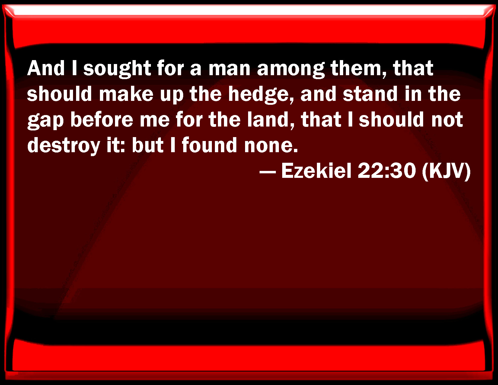 Bible Verse Slide Ezekiel 22:30 And I sought for a man among them, that should make up the hedge, and stand in the gap before me for the land, that I should not destroy it: but I found none. KJV: And I sought for a man among them, that should make up the hedge, and stand in the gap before me for the land, that I should not destroy it: but I found none. DRB: And I sought among them for a man that might set up a hedge, and stand in the gap before me in favour of the land, that I might not destroy it: and I found none. DBT: And I sought for a man among them, that should make up the fence, and stand in the breach before me for the land, that I should not destroy it; but I found none. ERV: And I sought for a man among them, that should make up the fence, and stand in the gap before me for the land, that I should not destroy it: but I found none. WBT: And I sought for a man among them, that should make up the hedge, and stand in the gap before me for the land, that I should not destroy it: but I found none. WEB: I sought for a man among them, who should build up the wall, and stand in the gap before me for the land, that I should not destroy it; but I found none. YLT: And I seek of them a man making a fence, And standing in the breach before Me, In behalf of the land — not to destroy it, And I have not found.Links Ezekiel 22:30 NIV • Ezekiel 22:30 NLT • Ezekiel 22:30 ESV • Ezekiel 22:30 NASB • Ezekiel 22:30 KJV • Ezekiel 22:30 Interlinear • Ezekiel 22:30 Commentaries • Ezekiel 22:30 Parallel Texts • Ezekiel 22:30 Bible Apps • Ezekiel 22:30 Parallel • Bible Hub |