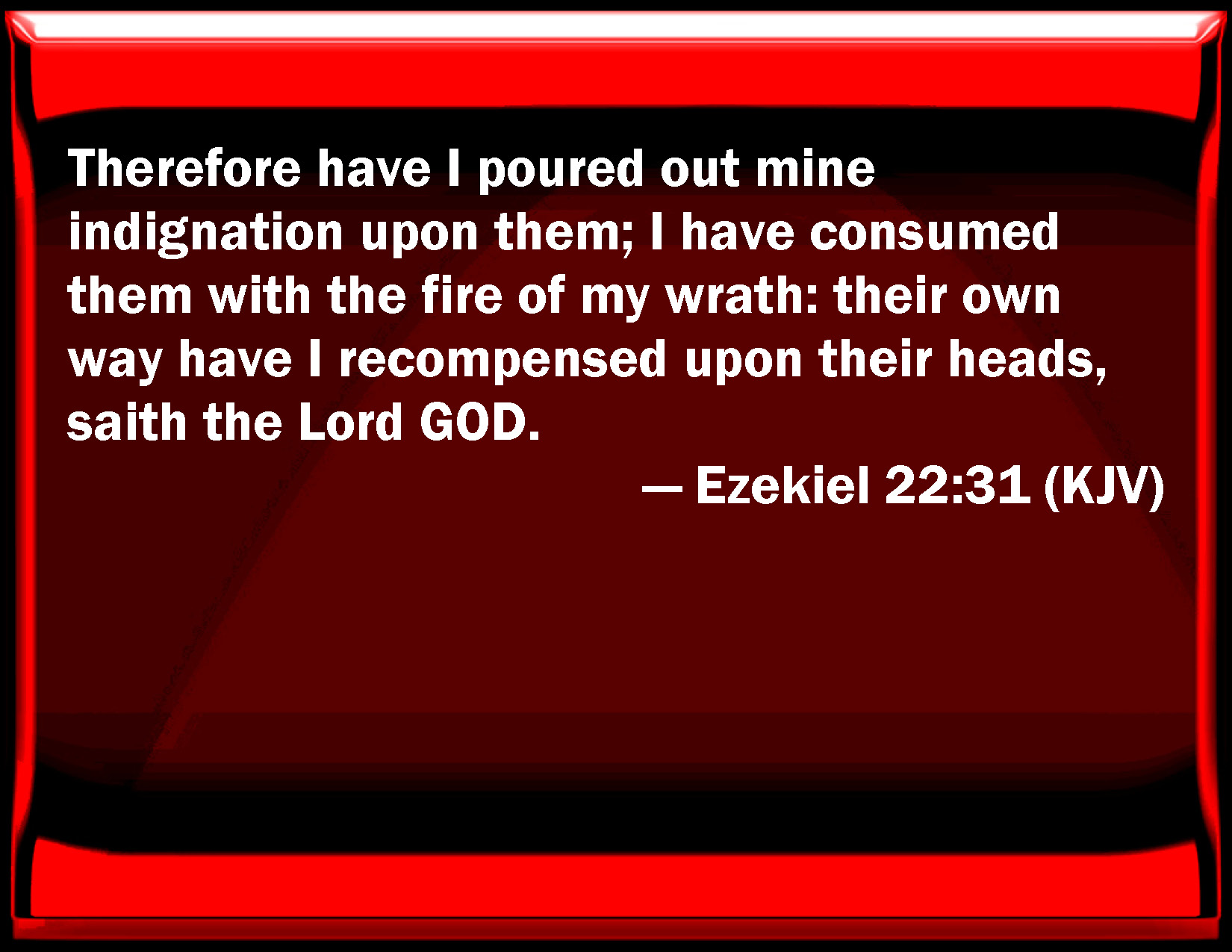 Bible Verse Slide Ezekiel 22:31 Therefore have I poured out my indignation on them; I have consumed them with the fire of my wrath: their own way have I recompensed on their heads, said the Lord GOD. KJV: Therefore have I poured out mine indignation upon them; I have consumed them with the fire of my wrath: their own way have I recompensed upon their heads, saith the Lord GOD. DRB: And I poured out my indignation upon them, in the fire of my wrath I consumed them: I have rendered their way upon their own head, saith the Lord God. DBT: And I will pour out mine indignation upon them; I will consume them in the fire of my wrath: their own way will I recompense upon their head, saith the Lord Jehovah. ERV: Therefore have I poured out mine indignation upon them; I have consumed them with the fire of my wrath: their own way have I brought upon their heads, saith the Lord GOD. WBT: Therefore have I poured out my indignation upon them; I have consumed them with the fire of my wrath: their own way have I recompensed upon their heads, saith the Lord GOD. WEB: Therefore have I poured out my indignation on them; I have consumed them with the fire of my wrath: their own way have I brought on their heads, says the Lord Yahweh. YLT: And I pour out on them mine indignation, By fire of My wrath I have consumed them, Their way on their own head I have put, An affirmation of the Lord Jehovah!'Links Ezekiel 22:31 NIV • Ezekiel 22:31 NLT • Ezekiel 22:31 ESV • Ezekiel 22:31 NASB • Ezekiel 22:31 KJV • Ezekiel 22:31 Interlinear • Ezekiel 22:31 Commentaries • Ezekiel 22:31 Parallel Texts • Ezekiel 22:31 Bible Apps • Ezekiel 22:31 Parallel • Bible Hub |