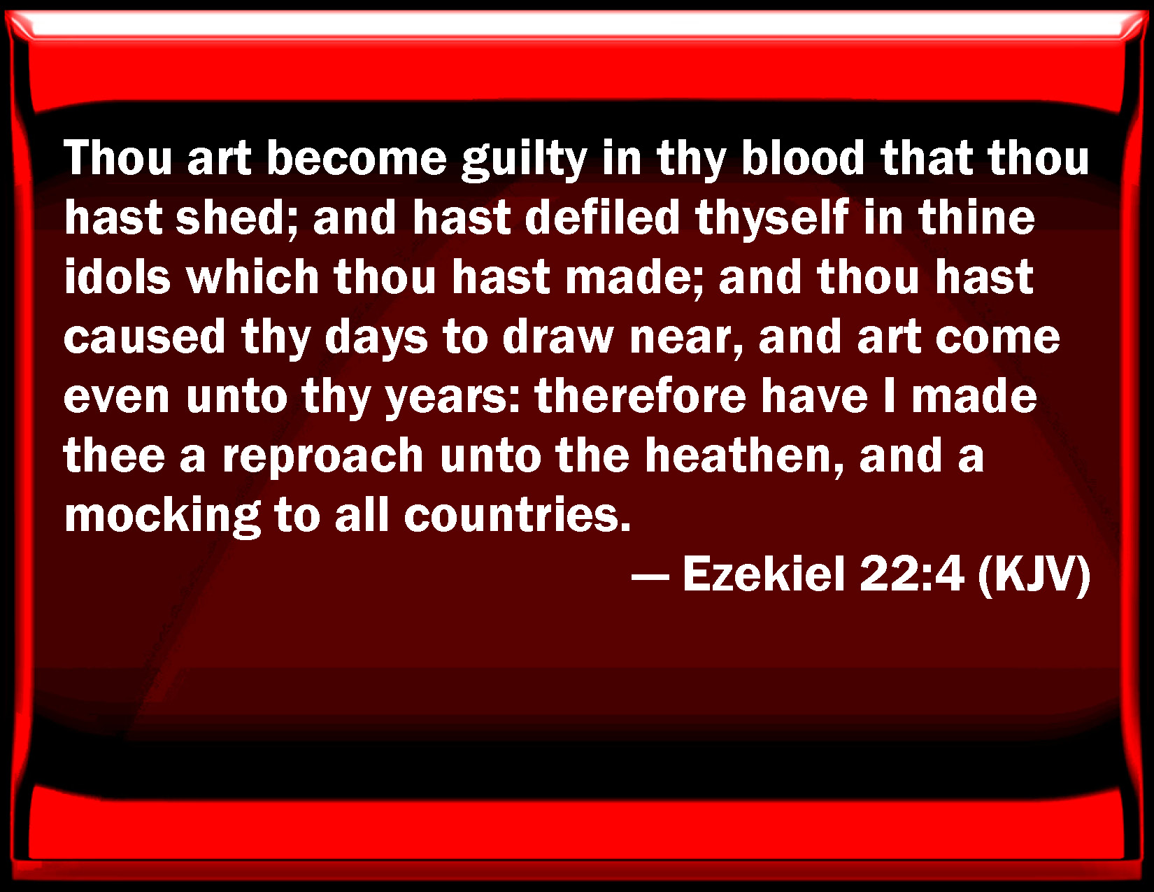Ezekiel 22:4 You are become guilty in your blood that you have shed; and have defiled yourself in your idols which you have made; and you have caused your days to draw near, and are come even to your years: therefore have I made you a reproach to the heathen, and a mocking to all countries.