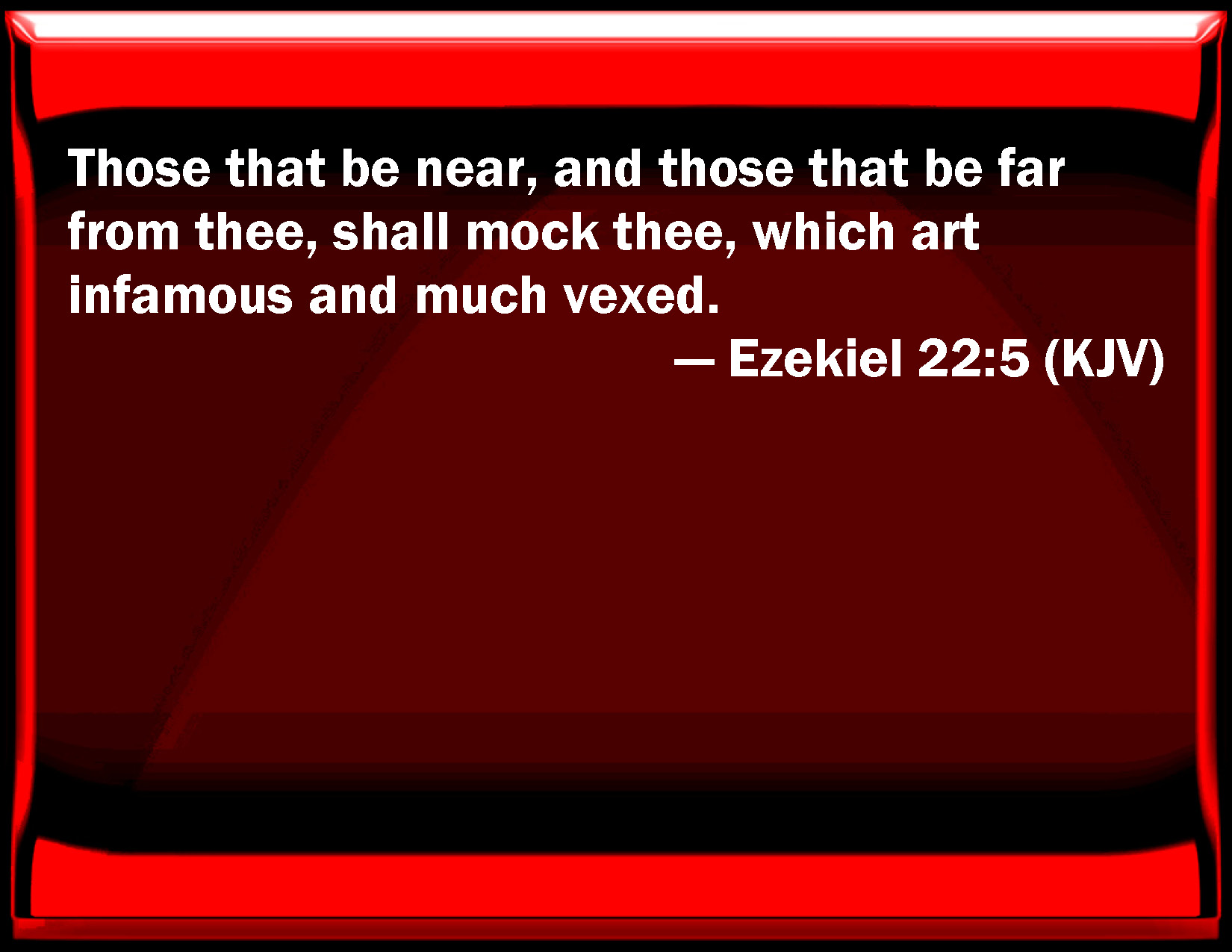 Bible Verse Slide Ezekiel 22:5 Those that be near, and those that be far from you, shall mock you, which are infamous and much vexed. KJV: Those that be near, and those that be far from thee, shall mock thee, which art infamous and much vexed. DRB: Those that are near, and those that are far from thee, shall triumph over thee: thou filthy one, infamous, great in destruction. DBT: Those that are near, and those that are far from thee, shall mock thee, who art infamous and full of tumult. ERV: Those that be near, and those that be far from thee, shall mock thee, thou infamous one and full of tumult. WBT: Those that are near, and those that are far from thee, shall mock thee, who art infamous and much troubled. WEB: Those who are near, and those who are far from you, shall mock you, you infamous one [and] full of tumult. YLT: The near and the far-off from thee scoff at thee, O defiled of name — abounding in trouble.Links Ezekiel 22:5 NIV • Ezekiel 22:5 NLT • Ezekiel 22:5 ESV • Ezekiel 22:5 NASB • Ezekiel 22:5 KJV • Ezekiel 22:5 Interlinear • Ezekiel 22:5 Commentaries • Ezekiel 22:5 Parallel Texts • Ezekiel 22:5 Bible Apps • Ezekiel 22:5 Parallel • Bible Hub |