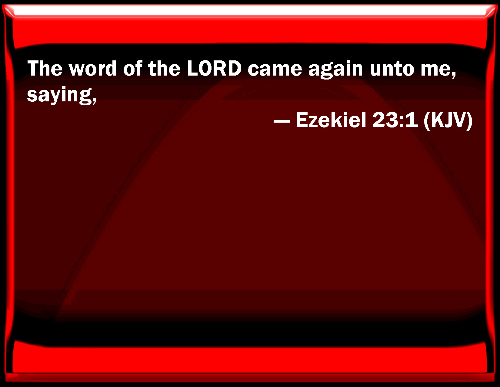Bible Verse Slide Ezekiel 23:1 The word of the LORD came again to me, saying, KJV: The word of the LORD came again unto me, saying, DRB: And the word of the Lord came to me, saying: DBT: And the word of Jehovah came unto me, saying, ERV: The word of the LORD came again unto me, saying, WBT: The word of the LORD came again to me, saying, WEB: The word of Yahweh came again to me, saying, YLT: And there is a word of Jehovah unto me, saying, 'Son of man,Links Ezekiel 23:1 NIV • Ezekiel 23:1 NLT • Ezekiel 23:1 ESV • Ezekiel 23:1 NASB • Ezekiel 23:1 KJV • Ezekiel 23:1 Interlinear • Ezekiel 23:1 Commentaries • Ezekiel 23:1 Parallel Texts • Ezekiel 23:1 Bible Apps • Ezekiel 23:1 Parallel • Bible Hub |