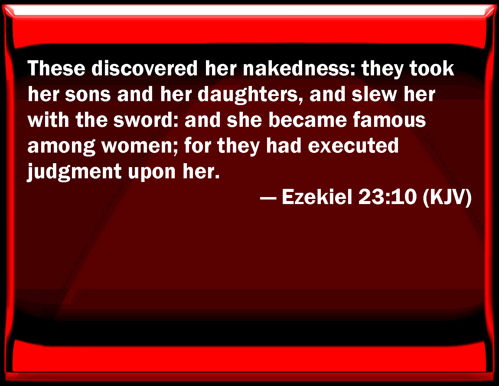 Bible Verse Slide Ezekiel 23:10 These discovered her nakedness: they took her sons and her daughters, and slew her with the sword: and she became famous among women; for they had executed judgment on her. KJV: These discovered her nakedness: they took her sons and her daughters, and slew her with the sword: and she became famous among women; for they had executed judgment upon her. DRB: They discovered her disgrace, took away her sons and daughters, and slew her with the sword: and they became infamous women, and they executed judgments in her. DBT: These discovered her nakedness, they took her sons and her daughters, and slew her with the sword; and she became a name among women; and they executed judgment upon her. ERV: These discovered her nakedness: they took her sons and her daughters, and her they slew with the sword: and she became a byword among women; for they executed judgments upon her. WBT: These uncovered her nakedness: they took her sons and her daughters, and slew her with the sword: and she became famous among women; for they had executed judgment upon her. WEB: These uncovered her nakedness; they took her sons and her daughters; and her they killed with the sword: and she became a byword among women; for they executed judgments on her. YLT: They have uncovered her nakedness, Her sons and her daughters they have taken, And her by sword they have slain, And she is a name for women, And judgments they have done with her.Links Ezekiel 23:10 NIV • Ezekiel 23:10 NLT • Ezekiel 23:10 ESV • Ezekiel 23:10 NASB • Ezekiel 23:10 KJV • Ezekiel 23:10 Interlinear • Ezekiel 23:10 Commentaries • Ezekiel 23:10 Parallel Texts • Ezekiel 23:10 Bible Apps • Ezekiel 23:10 Parallel • Bible Hub |
