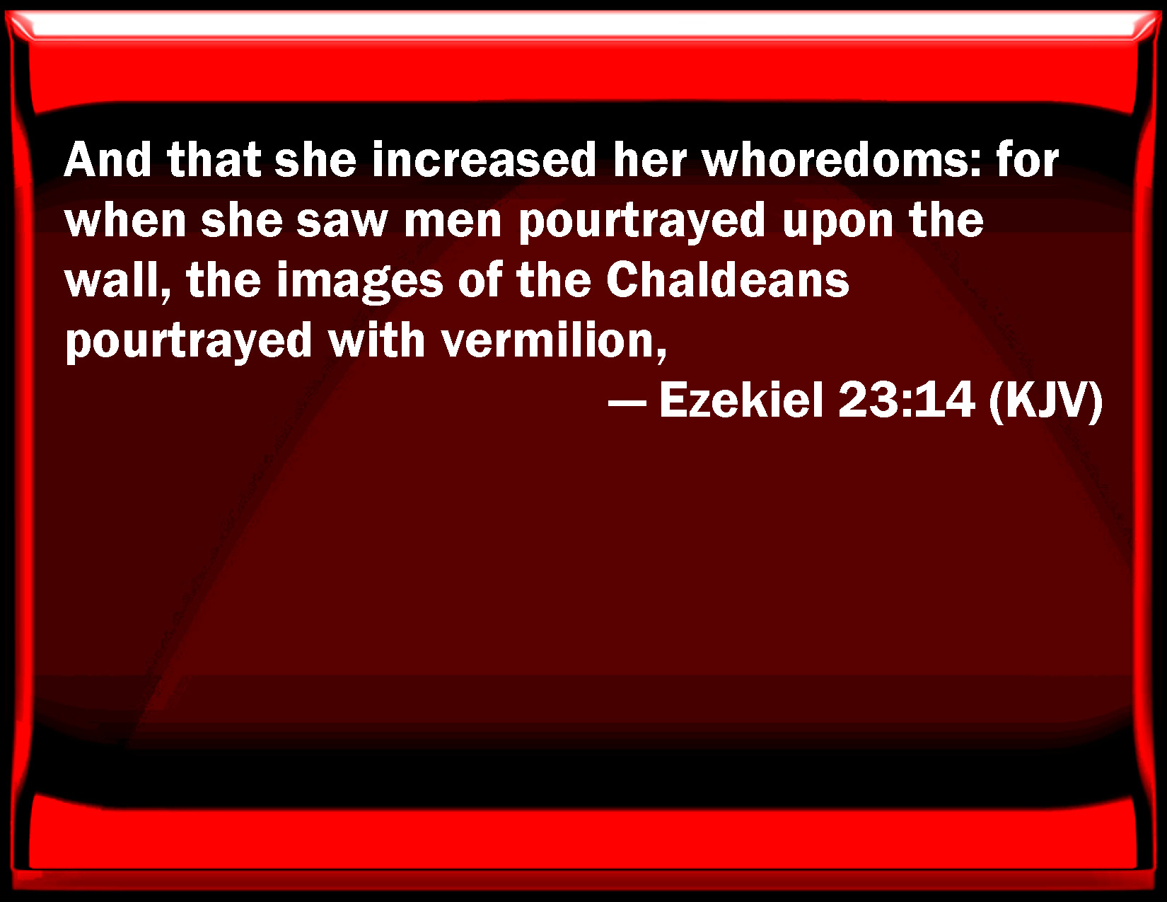 Bible Verse Slide Ezekiel 23:14 And that she increased her prostitutions: for when she saw men portrayed on the wall, the images of the Chaldeans portrayed with vermilion, KJV: And that she increased her whoredoms: for when she saw men pourtrayed upon the wall, the images of the Chaldeans pourtrayed with vermilion, DRB: And she increased her fornications: and when she had seen men painted on the wall, the images of the Chaldeans set forth in colours, DBT: And she increased her fornications; for she saw men portrayed upon the wall, the images of the Chaldeans portrayed with vermilion, ERV: And she increased her whoredoms; for she saw men pourtrayed upon the wall, the images of the Chaldeans pourtrayed with vermilion, WBT: And that she increased her prostitutions: for when she saw men pourtrayed upon the wall, the images of the Chaldeans pourtrayed with vermilion. WEB: She increased her prostitution; for she saw men portrayed on the wall, the images of the Chaldeans portrayed with vermilion, YLT: And she doth add unto her whoredoms, And she seeth graved men on the wall, Pictures of Chaldeans, graved with red lead,Links Ezekiel 23:14 NIV • Ezekiel 23:14 NLT • Ezekiel 23:14 ESV • Ezekiel 23:14 NASB • Ezekiel 23:14 KJV • Ezekiel 23:14 Interlinear • Ezekiel 23:14 Commentaries • Ezekiel 23:14 Parallel Texts • Ezekiel 23:14 Bible Apps • Ezekiel 23:14 Parallel • Bible Hub |