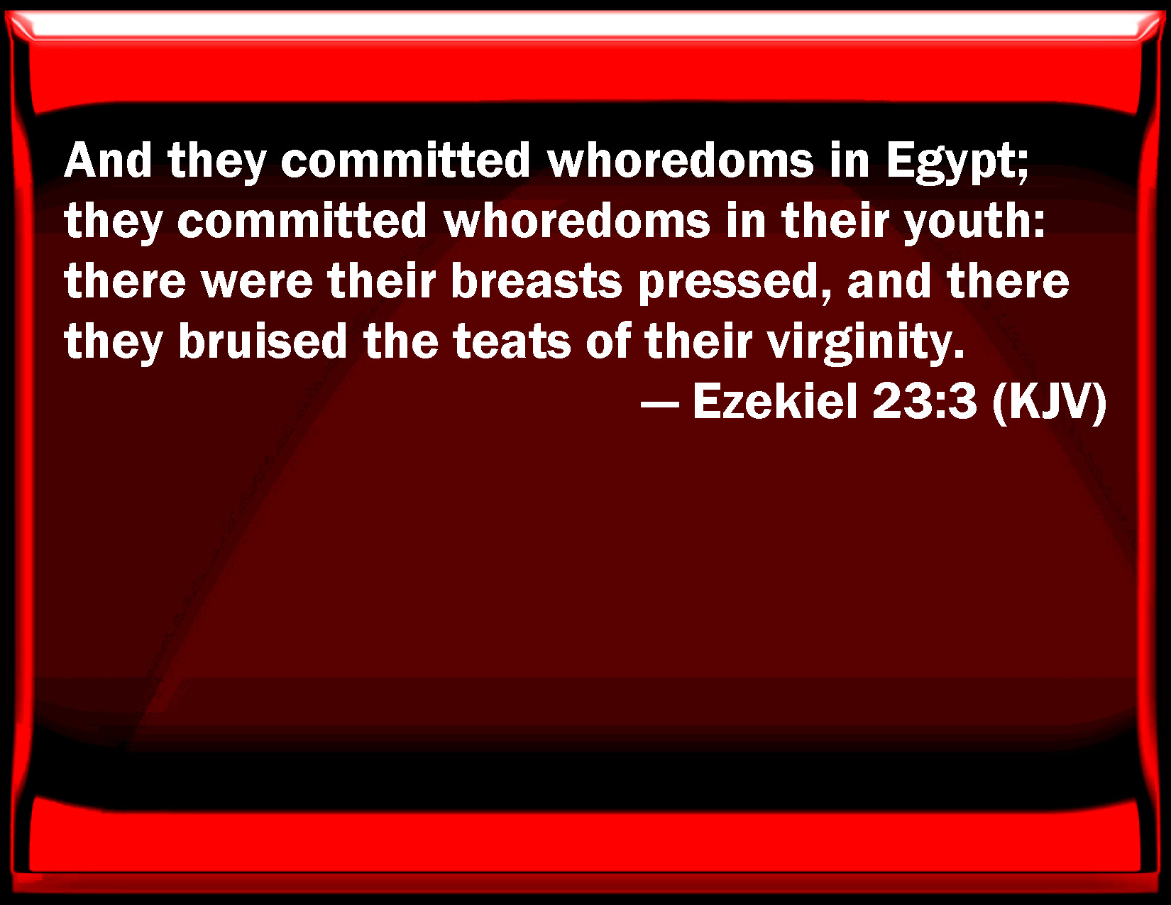 Bible Verse Slide Ezekiel 23:3 And they committed prostitutions in Egypt; they committed prostitutions in their youth: there were their breasts pressed, and there they bruised the teats of their virginity. KJV: And they committed whoredoms in Egypt; they committed whoredoms in their youth: there were their breasts pressed, and there they bruised the teats of their virginity. DRB: And they committed fornication in Egypt, in their youth they committed fornication: there were their breasts pressed down, and the teats of their virginity were bruised. DBT: And they committed whoredom in Egypt; they committed whoredom in their youth: there were their breasts pressed, and there were handled the teats of their virginity. ERV: and they committed whoredoms in Egypt; they committed whoredoms in their youth: there were their breasts pressed, and there they bruised the teats of their virginity. WBT: And they committed lewd deeds in Egypt; they committed lewd deeds in their youth: there were their breasts pressed, and there they were first corrupted. WEB: and they played the prostitute in Egypt; they played the prostitute in their youth; there were their breasts pressed, and there was handled the bosom of their virginity. YLT: And they go a-whoring in Egypt, In their youth they have gone a-whoring, There they have bruised their breasts, And there they have dealt with the loves of their virginity.Links Ezekiel 23:3 NIV • Ezekiel 23:3 NLT • Ezekiel 23:3 ESV • Ezekiel 23:3 NASB • Ezekiel 23:3 KJV • Ezekiel 23:3 Interlinear • Ezekiel 23:3 Commentaries • Ezekiel 23:3 Parallel Texts • Ezekiel 23:3 Bible Apps • Ezekiel 23:3 Parallel • Bible Hub |