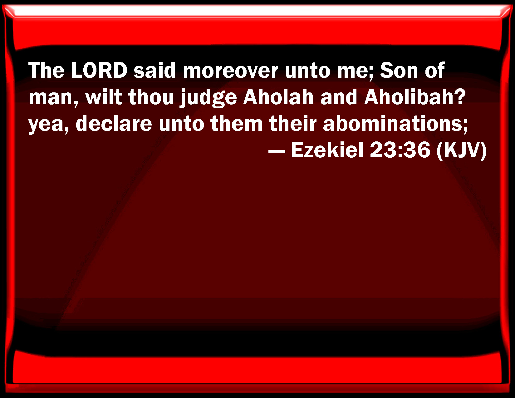 Bible Verse Slide Ezekiel 23:36 The LORD said moreover to me; Son of man, will you judge Aholah and Aholibah? yes, declare to them their abominations; KJV: The LORD said moreover unto me; Son of man, wilt thou judge Aholah and Aholibah? yea, declare unto them their abominations; DRB: And the Lord spoke to me, saying: Son of man, dost thou judge Oolla, and Ooliba, and dost thou declare to them their wicked deeds? DBT: And Jehovah said unto me, Son of man, wilt thou judge Oholah and Oholibah? yea, declare unto them their abominations. ERV: The LORD said moreover unto me: Son of man, wilt thou judge Oholah and Oholibah? then declare unto them their abominations. WBT: The LORD said moreover to me; Son of man, wilt thou judge Aholah and Aholibah? yes, declare to them their abominations; WEB: Yahweh said moreover to me: Son of man, will you judge Oholah and Oholibah? then declare to them their abominations. YLT: And Jehovah saith unto me, 'Son of man, Dost thou judge Aholah and Aholibah? Declare then to them their abominations.Links Ezekiel 23:36 NIV • Ezekiel 23:36 NLT • Ezekiel 23:36 ESV • Ezekiel 23:36 NASB • Ezekiel 23:36 KJV • Ezekiel 23:36 Interlinear • Ezekiel 23:36 Commentaries • Ezekiel 23:36 Parallel Texts • Ezekiel 23:36 Bible Apps • Ezekiel 23:36 Parallel • Bible Hub |