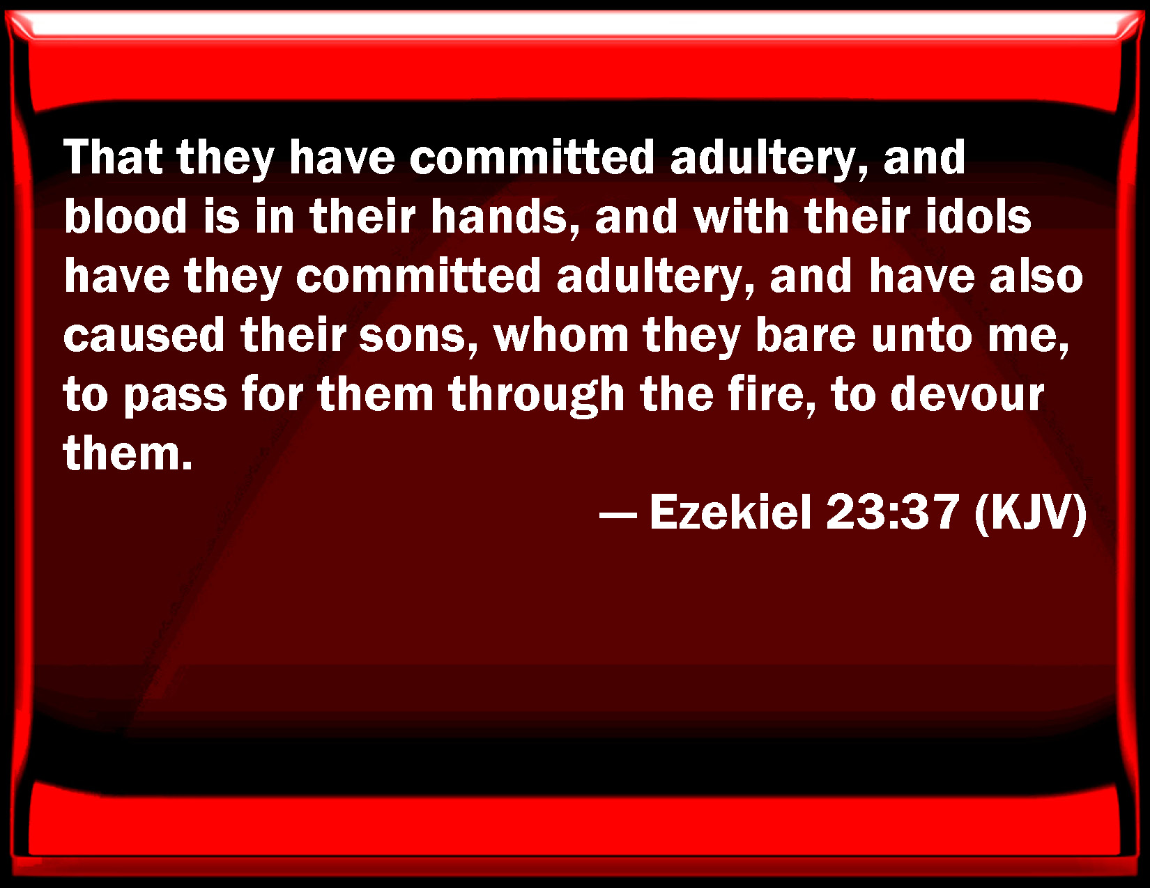 Bible Verse Slide Ezekiel 23:37 That they have committed adultery, and blood is in their hands, and with their idols have they committed adultery, and have also caused their sons, whom they bore to me, to pass for them through the fire, to devour them. KJV: That they have committed adultery, and blood is in their hands, and with their idols have they committed adultery, and have also caused their sons, whom they bare unto me, to pass for them through the fire, to devour them. DRB: Because they have committed adultery, and blood is in their hands, and they have committed fornication with their idols: moreover also their children, whom they bore to me, they have offered to them to be devoured. DBT: For they have committed adultery, and blood is in their hands; and with their idols have they committed adultery, and have also passed over unto them their children, whom they bore unto me, to be devoured. ERV: For they have committed adultery, and blood is in their hands, and with their idols have they committed adultery; and they have also caused their sons, whom they bare unto me, to pass through the fire unto them to be devoured. WBT: That they have committed adultery, and blood is in their hands, and with their idols have they committed adultery, and have also caused their sons, whom they bore to me, to pass for them through the fire, to devour them. WEB: For they have committed adultery, and blood is in their hands; and with their idols have they committed adultery; and they have also caused their sons, whom they bore to me, to pass through [the fire] to them to be devoured. YLT: For they have committed adultery, And blood is in their hands, With their idols they committed adultery, And also their sons whom they bore to Me, They caused to pass over to them for food.Links Ezekiel 23:37 NIV • Ezekiel 23:37 NLT • Ezekiel 23:37 ESV • Ezekiel 23:37 NASB • Ezekiel 23:37 KJV • Ezekiel 23:37 Interlinear • Ezekiel 23:37 Commentaries • Ezekiel 23:37 Parallel Texts • Ezekiel 23:37 Bible Apps • Ezekiel 23:37 Parallel • Bible Hub |