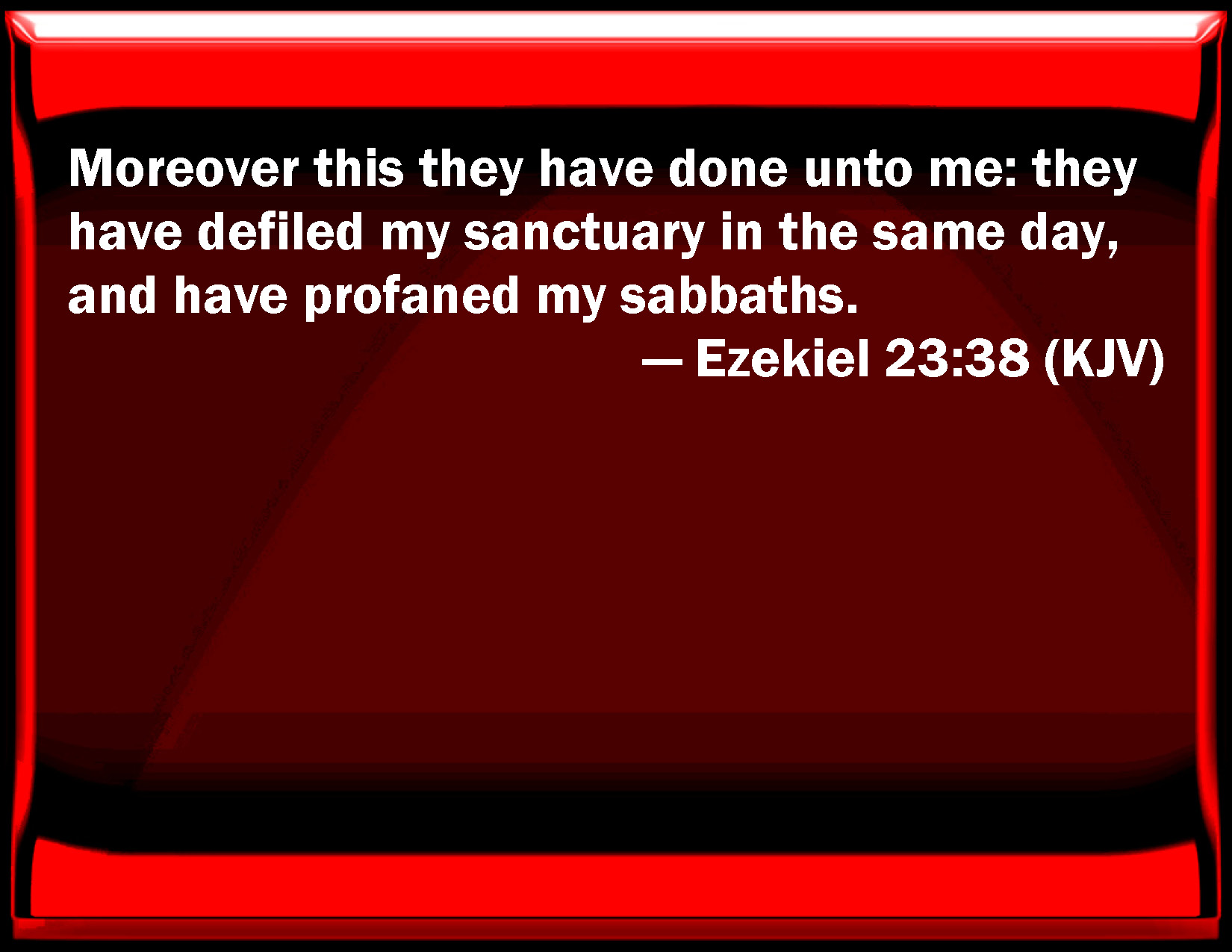 Bible Verse Slide Ezekiel 23:38 Moreover this they have done to me: they have defiled my sanctuary in the same day, and have profaned my sabbaths. KJV: Moreover this they have done unto me: they have defiled my sanctuary in the same day, and have profaned my sabbaths. DRB: Yea, and they have done this to me. They polluted my sanctuary on the same day, and profaned my sabbaths. DBT: Moreover this have they done unto me: in the same day have they defiled my sanctuary and profaned my sabbaths. ERV: Moreover this they have done unto me: they have defiled my sanctuary in the same day, and have profaned my sabbaths. WBT: Moreover this they have done to me: they have defiled my sanctuary in the same day, and have profaned my sabbaths. WEB: Moreover this they have done to me: they have defiled my sanctuary in the same day, and have profaned my Sabbaths. YLT: Again, this they have done to Me, They defiled My sanctuary in that day, And My sabbaths they have polluted.Links Ezekiel 23:38 NIV • Ezekiel 23:38 NLT • Ezekiel 23:38 ESV • Ezekiel 23:38 NASB • Ezekiel 23:38 KJV • Ezekiel 23:38 Interlinear • Ezekiel 23:38 Commentaries • Ezekiel 23:38 Parallel Texts • Ezekiel 23:38 Bible Apps • Ezekiel 23:38 Parallel • Bible Hub |